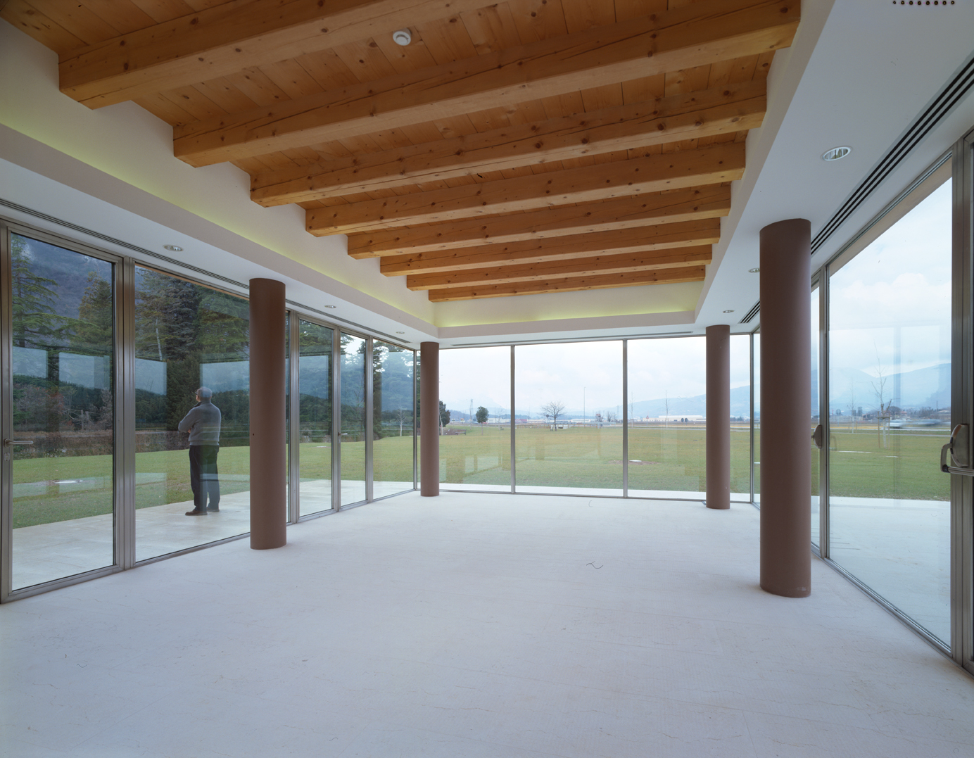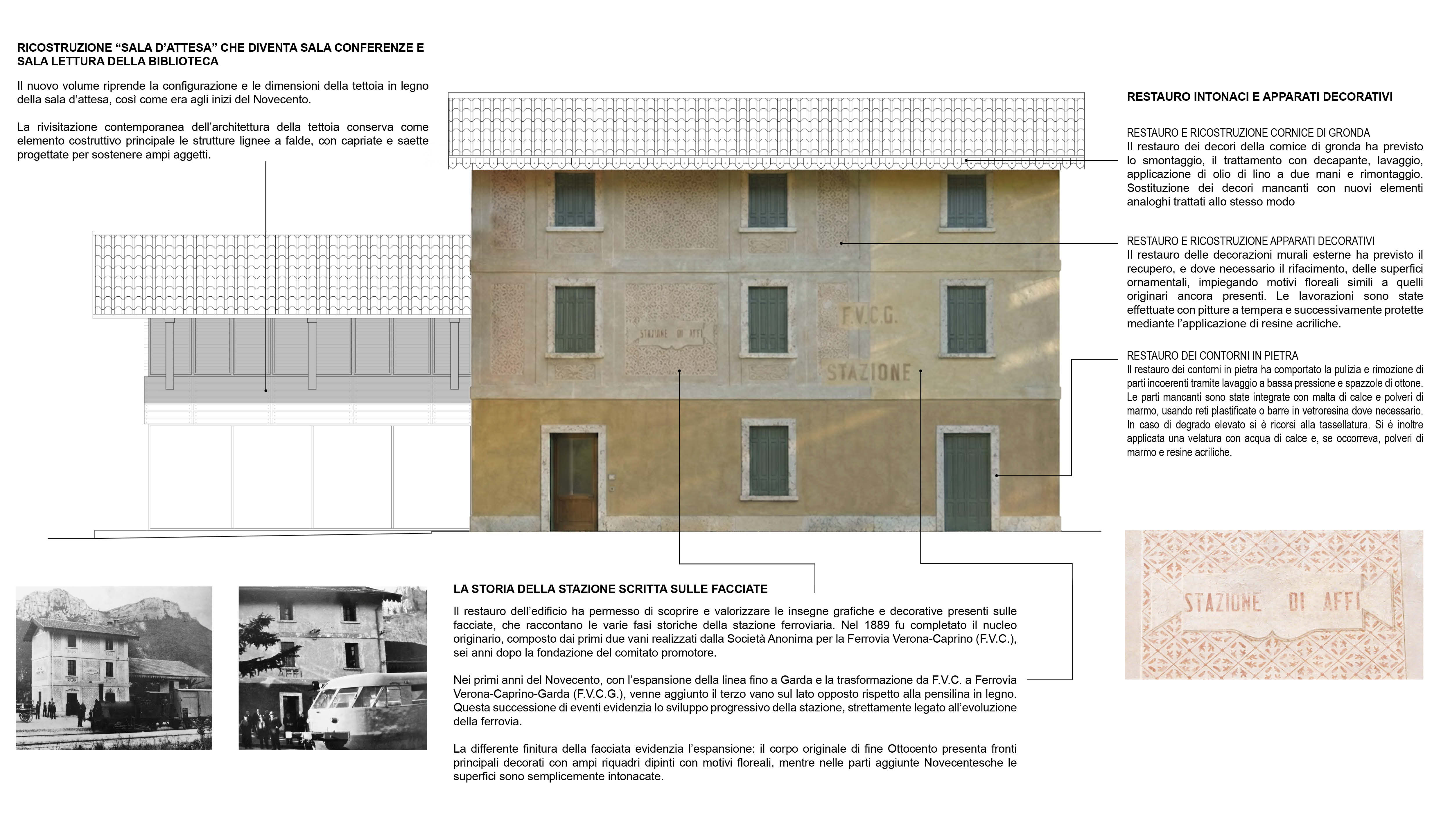 Il restauro delle facciate è stato condotto secondo criteri filologici, valorizzando le decorazioni storiche che testimoniano il passato della linea ferroviaria Verona Caprino–Garda, inattiva dagli anni Cinquanta. Parallelamente, la ricostruzione della tettoia risponde alle nuove esigenze funzionali, senza perdere il legame con la memoria spaziale e funzionale dell’edificio storico. Sono stati mantenuti i materiali, la forma e le dimensioni originali, ma reinterpretati con linee contemporanee: gli elementi lignei a falde, capriate e saette sostengono ampie sporgenze che ombreggiano le nuove sale della biblioteca. La sala conferenze, al piano terra, si caratterizza per le pareti vetrate che creano continuità tra interno ed esterno, evocando l’atmosfera della vecchia sala d’attesa. Al piano superiore, la finestra a nastro della sala di lettura offre uno sguardo aperto sulla vallata, evocando l’esperienza del viaggio in treno.