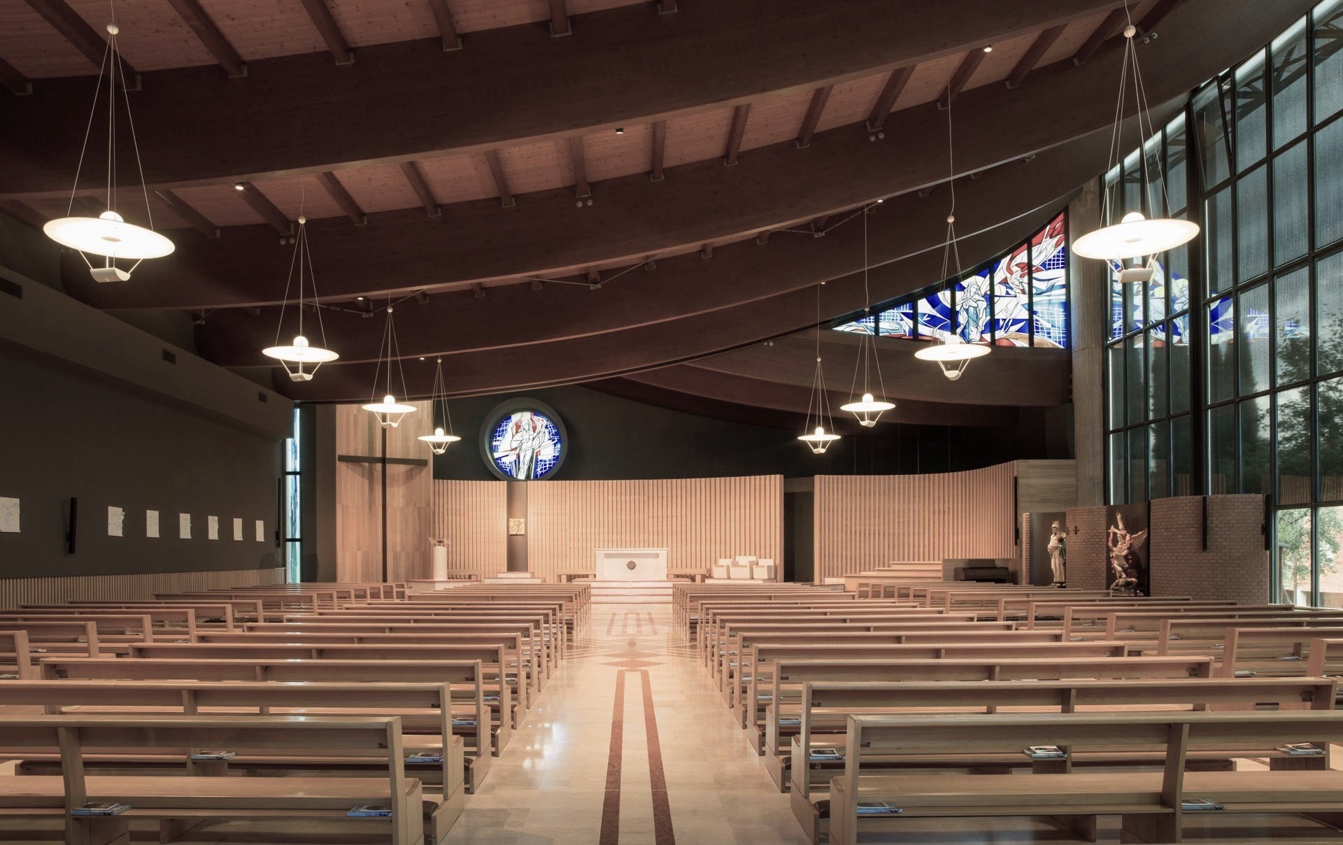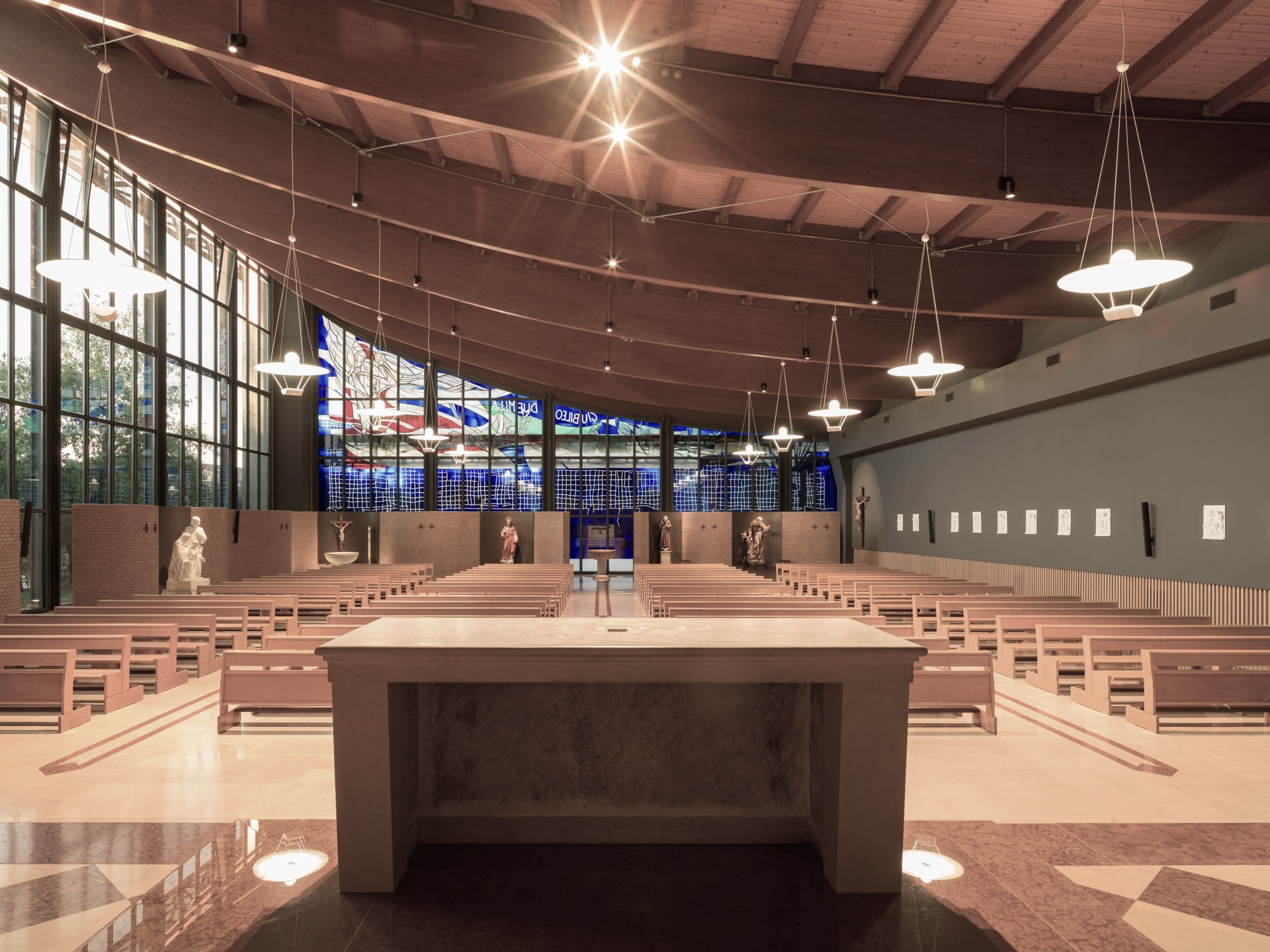 La chiesa, realizzata negli anni ’90 su progetto dell’architetto Giuliano Visconti, si presenta come un edificio di notevole rilievo architettonico e valenza simbolica, ispirata alla metafora della “tenda di Dio con gli uomini”. La struttura si articola in due campate: il presbiterio, che rappresenta la tenda divina, e la navata, intesa come tenda degli uomini, la quale si apre verso il contesto urbano grazie a vaste superfici vetrate sui lati sud e ovest. Sebbene le vetrate artistiche conferiscano notevole rilevanza scenografica all’insieme, l’ampiezza delle superfici trasparenti ha determinato un’eccessiva luminosità, compromettendo il comfort ambientale e il benessere dei fedeli. Inoltre, la disposizione originaria dell’area presbiteriale non favoriva la definizione dello spazio sacro, a causa della collocazione poco armonica ed eterogena dei poli liturgici.