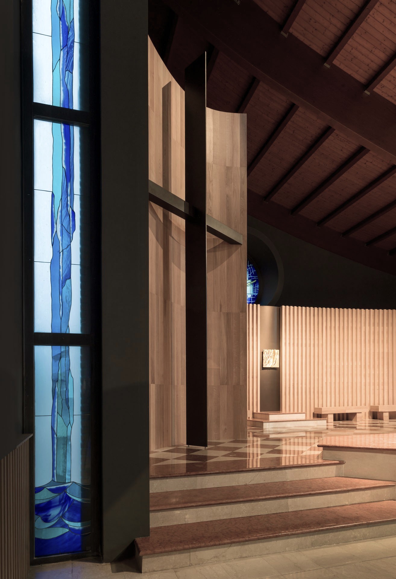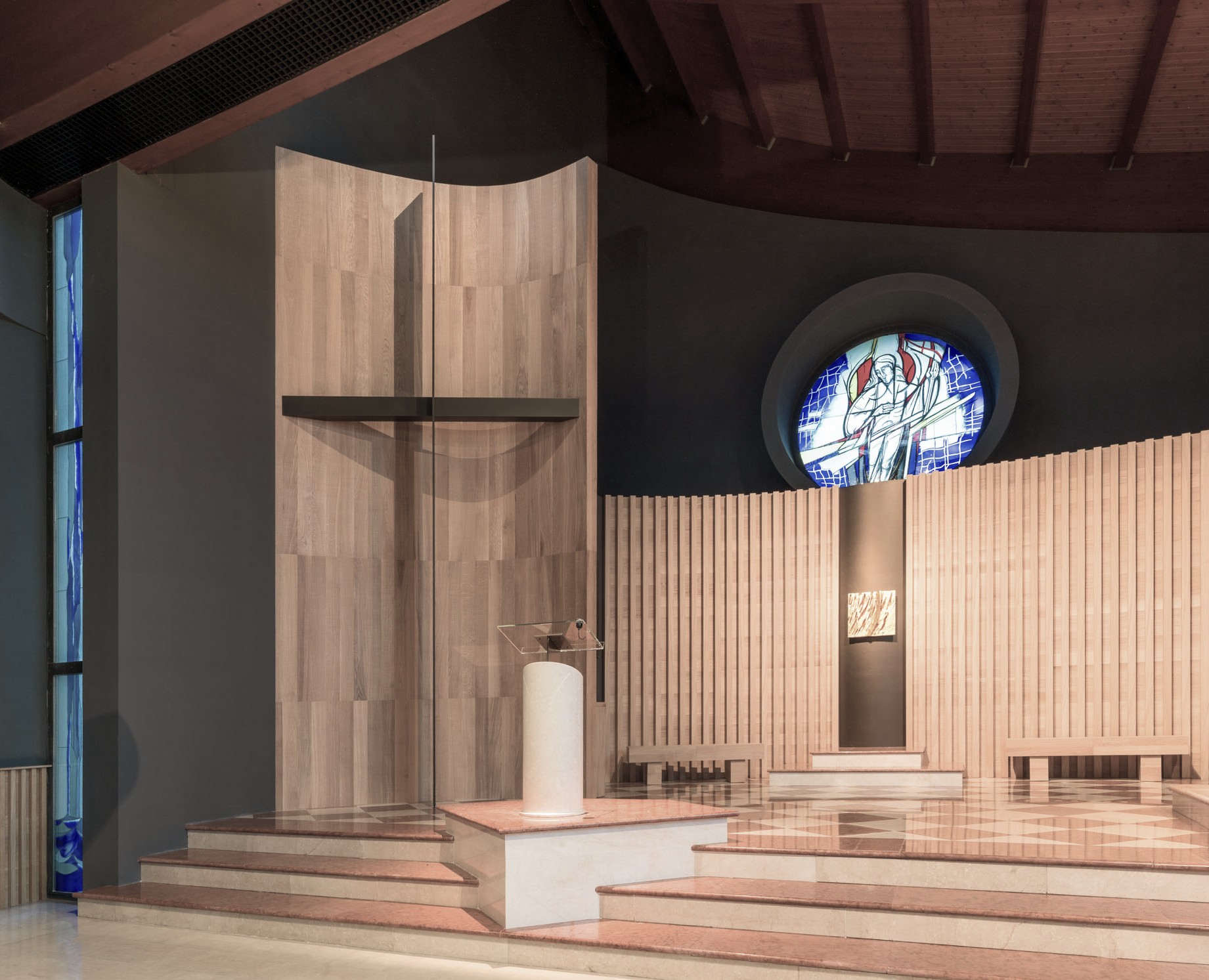 Dopo aver ottimizzato la luminosità e la cromia della “tenda degli uomini”, il progetto si è focalizzato verso la ricostruzione della “tenda di Dio”, con l’obiettivo di garantirne la proporzionalità e la centralità rispetto al grande volume interno. L’area absidale e la sacrestia retrostante sono state ricostruite mediante una sequenza di quinte concave rivestite in legno, finalizzate a definire i poli liturgici, la nuova croce monumentale e lo spazio destinato al coro. Il sistema delle quinte, che riprendono l’andamento dinamico delle quinte in mattoni dell’aula, trova il suo punto culminante nel tabernacolo in vetro e oro realizzato da Giuliano Gaigher, collocato sotto la vetrata circolare raffigurante il Cristo Risorto. Sono stati inoltre rinnovati la sede del celebrante, l’ambone e l’altare, ora disposti su pedane marmoree che ne valorizzano la posizione centrale e la visibilità all’interno dell’area liturgica.