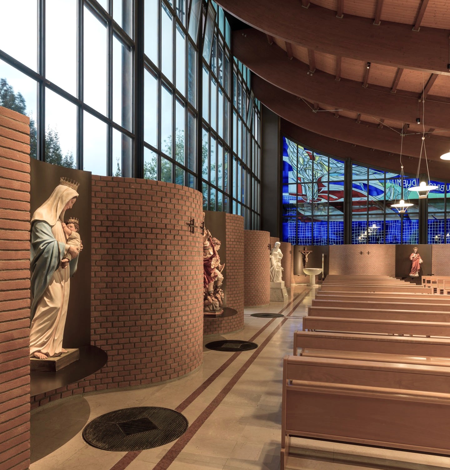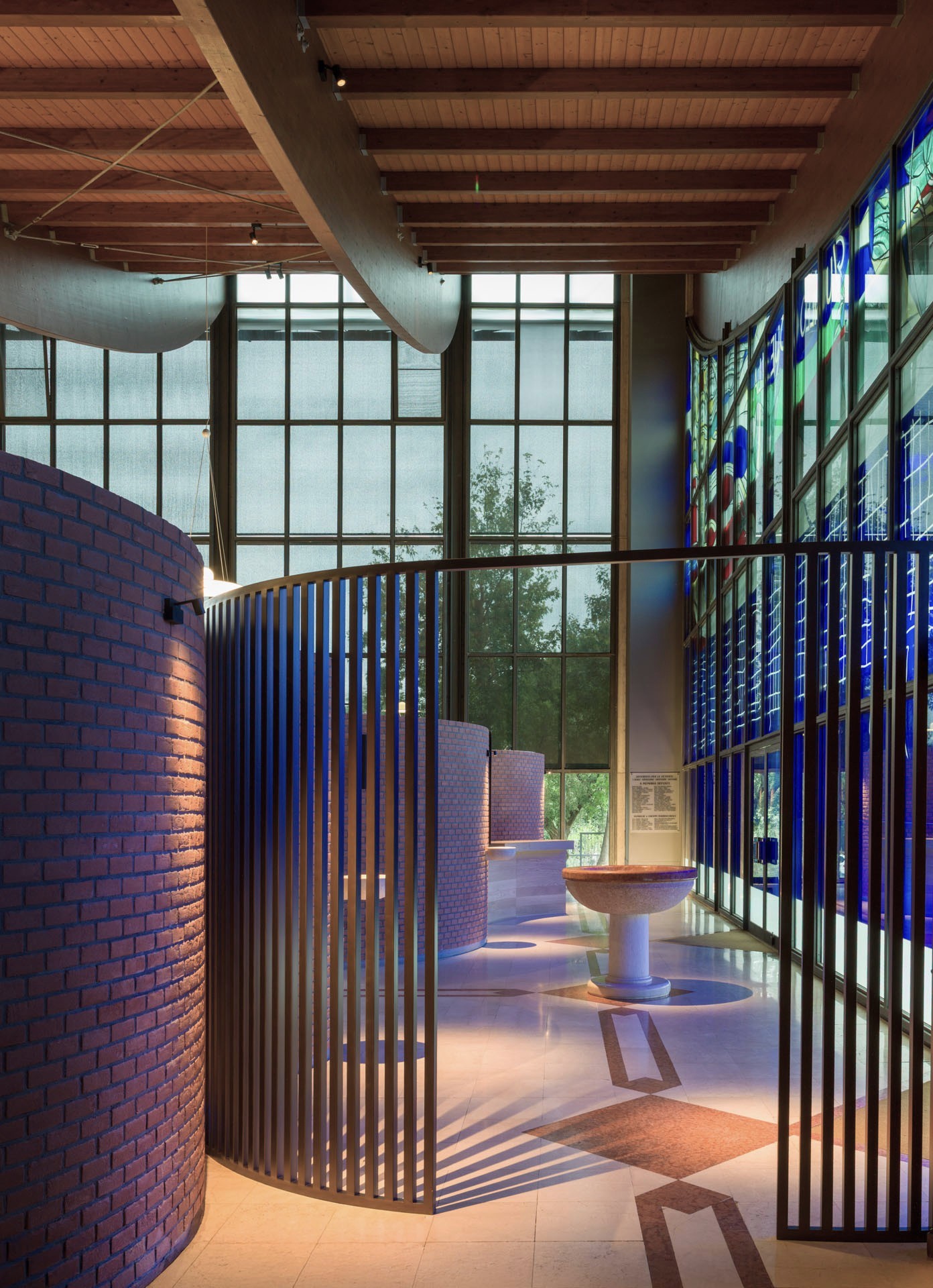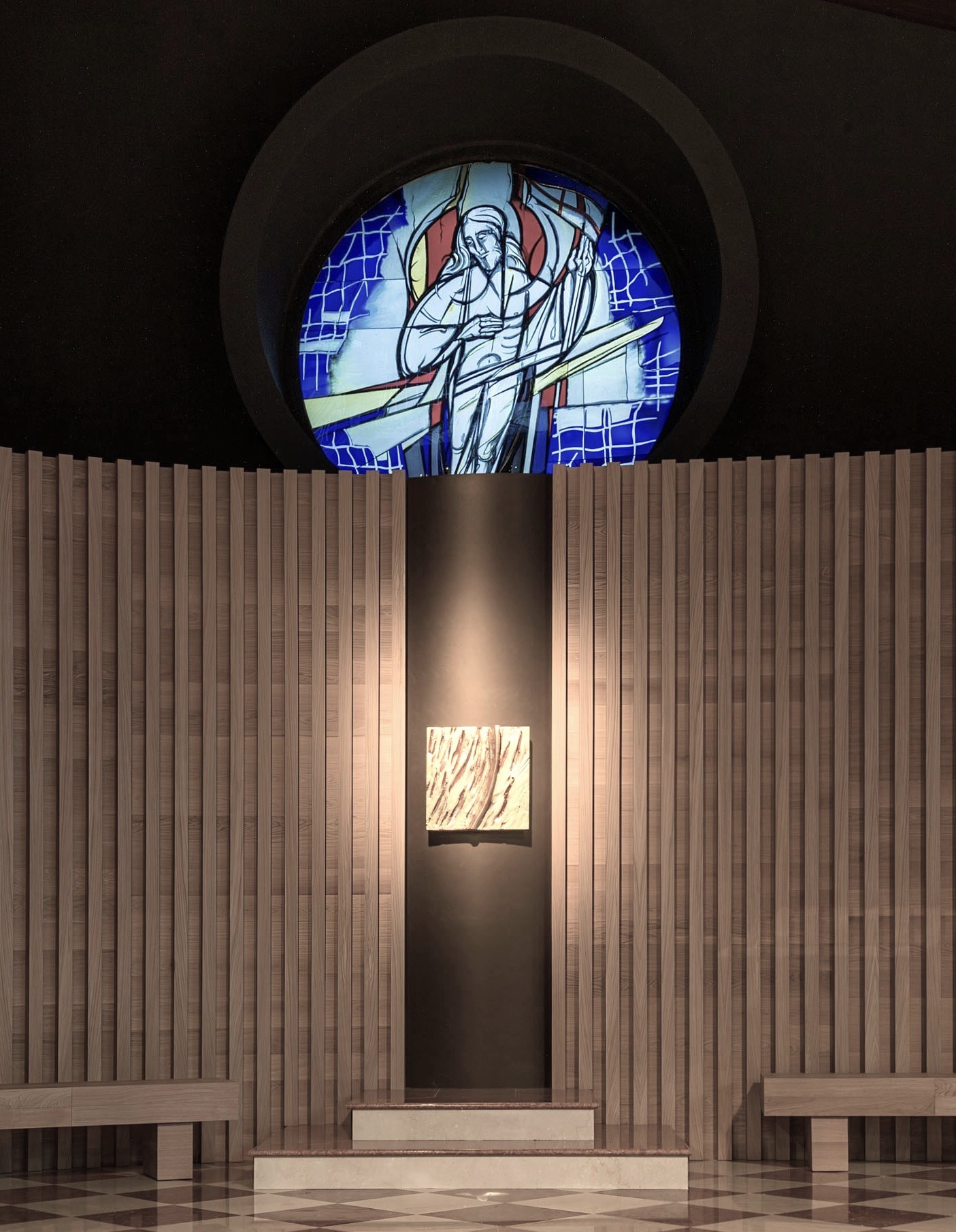 L’intero progetto si fonda sulla ricerca di una dimensione sacra anche all’interno di un ambiente contemporaneo e complesso, caratterizzato da geometrie variabili ed ampie superfici vetrate. L’equilibrio perseguito è stato raggiunto mediante la sintesi tra i materiali – vetro, marmo, mattoni, legno, elementi metallici e intonaci scuri - ed illuminazione “significante”. Il risultato è un’atmosfera intensa e coerente, in cui tutti gli elementi risultano integrati e chiaramente leggibili, favorendo raccoglimento e spiritualità senza rinunciare a modernità e funzionalità.