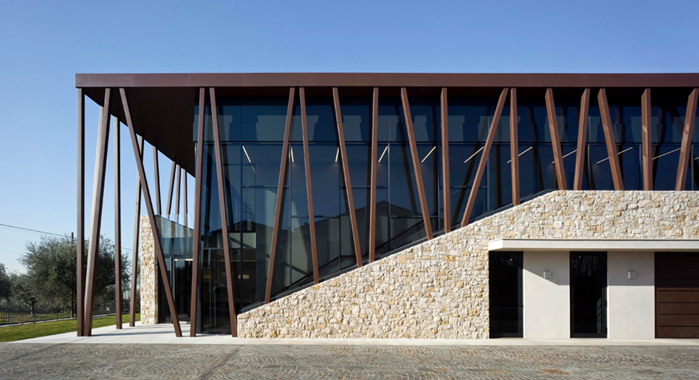La cantina allude a due elementi tipici del paesaggio del Lago di Garda, i muri dei terrazzamenti e i pali delle vigne.