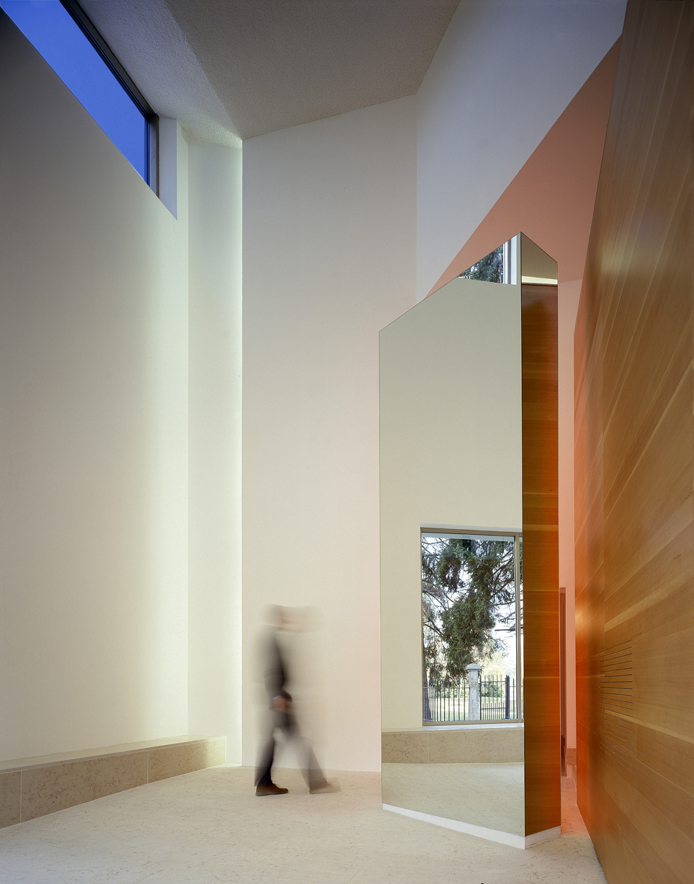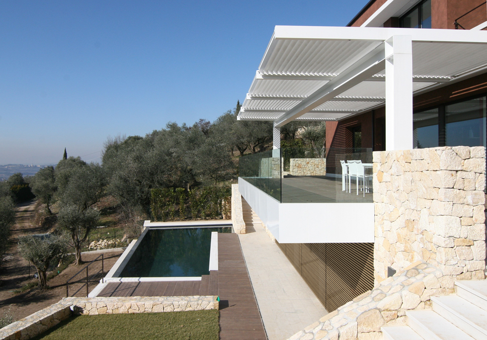 L’edificio si integra nelle balze esistenti del terreno; tutti i livelli sono collegati da scale e rampe dando l’impressione che la casa fluttui tra gli ulivi.