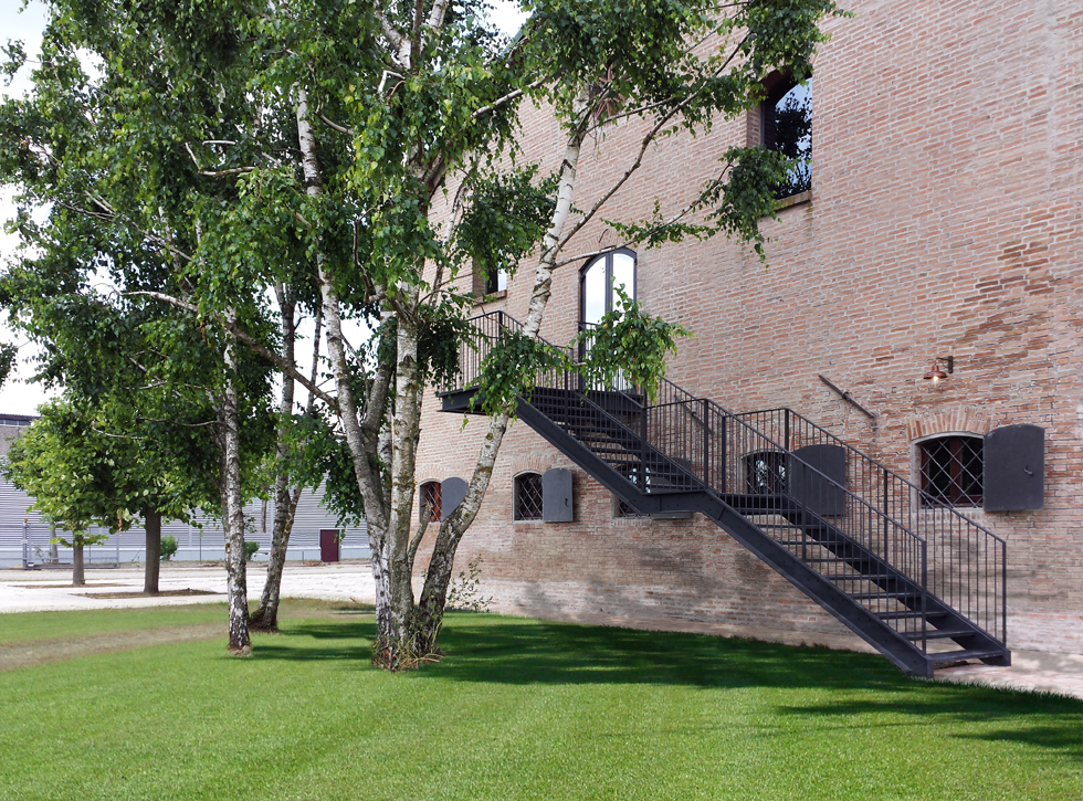 Il restauro dell’“ex casa colonica” delle cantine modenesi valorizza i paramenti murari in cotto testimonianza dell’edilizia tradizionale locale.