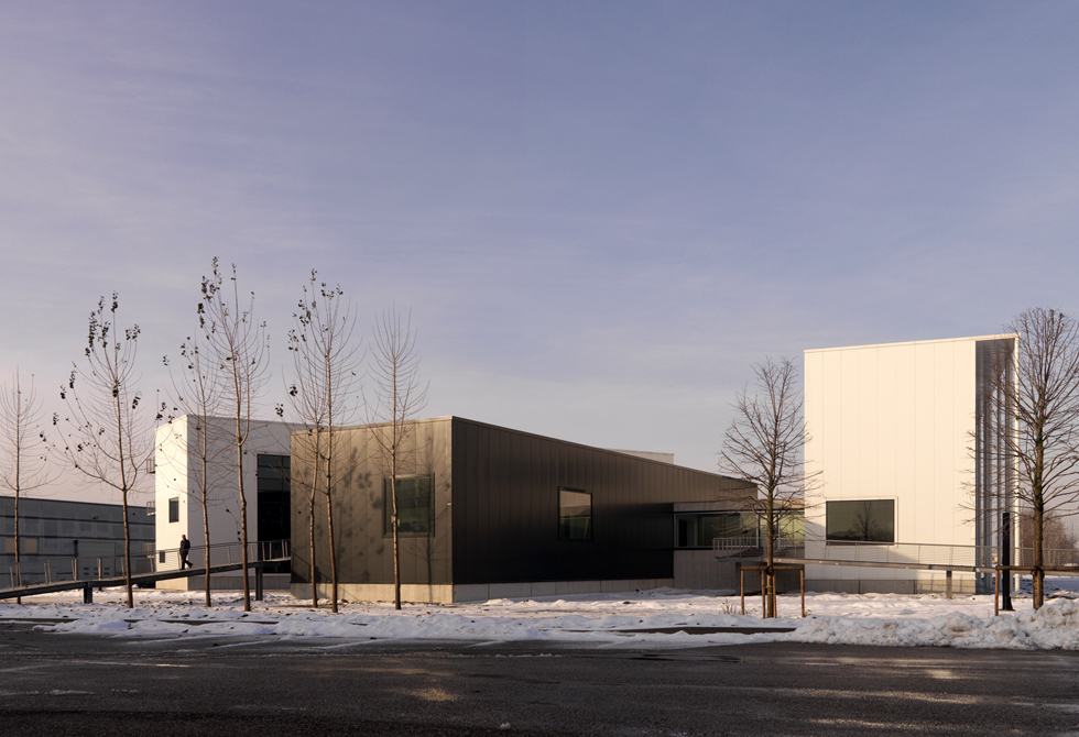 Il volume del nuovo ingresso visitatori si inserisce come innesto di architettura contemporanea tra le pieghe della palazzina uffici esistente e il giardino alberato.