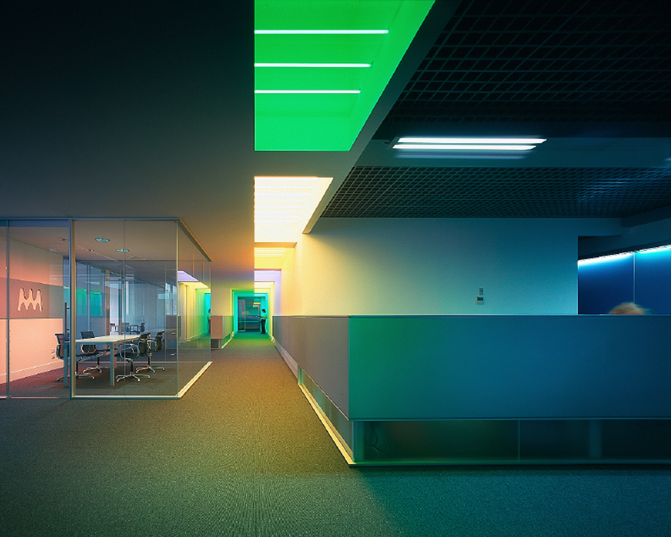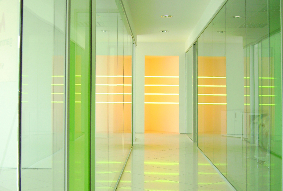Il corridoio di Gamma Ufficio a Bassano del Grappa diventa un ambiente insolito, stimolante, che interagisce con il visitatore tramite la percezione visiva.