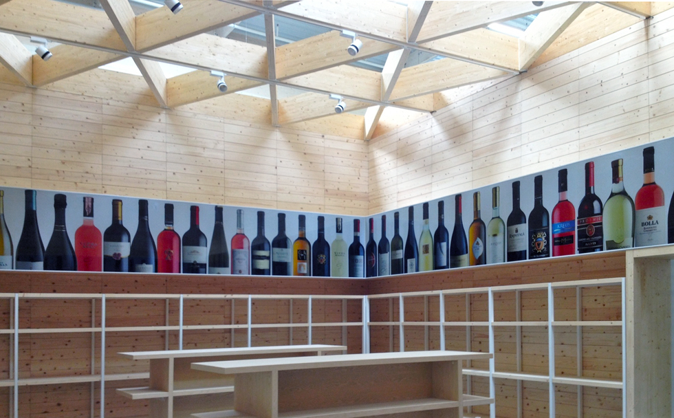 Lo spazio espositivo della tenuta Preella a Cavaion Veronese ospita la fornitissima enoteca del GIV, il maggiore gruppo vitivinicolo italiano di cui Lamberti fa parte.