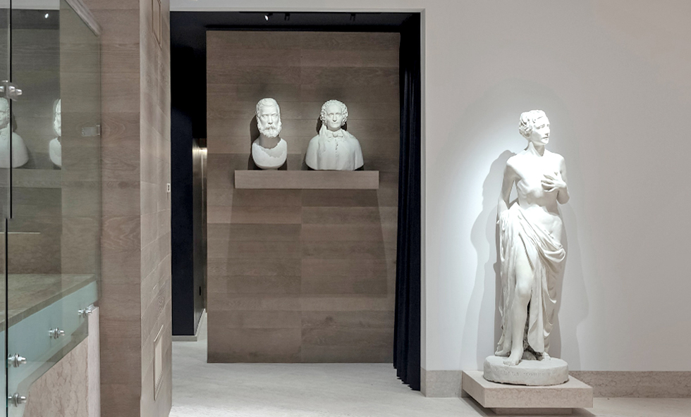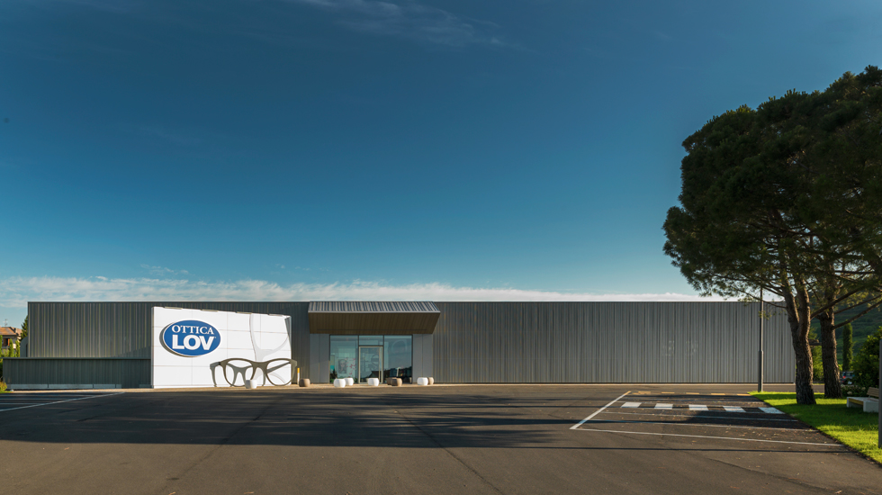 La facciata, rivestita da un prezioso velo traforato, si apre sollevandosi e accompagna il visitatore all’interno dove “nascono le lenti”.