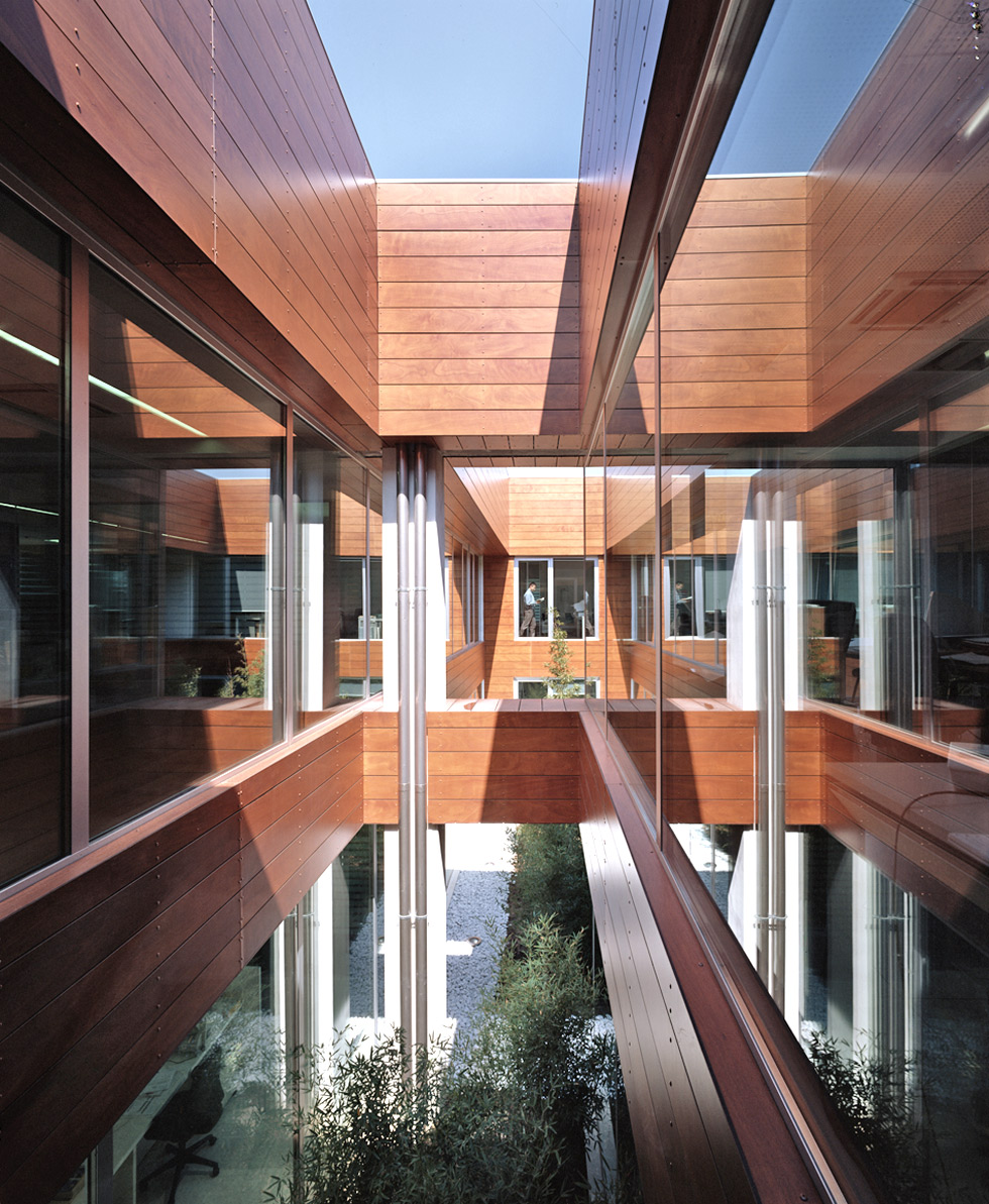 Nello spazio di una corte per uffici, il visitatore sperimenta la convivenza tra natura ed artificio, verde, legno, luce, trasparenze e riflessi.