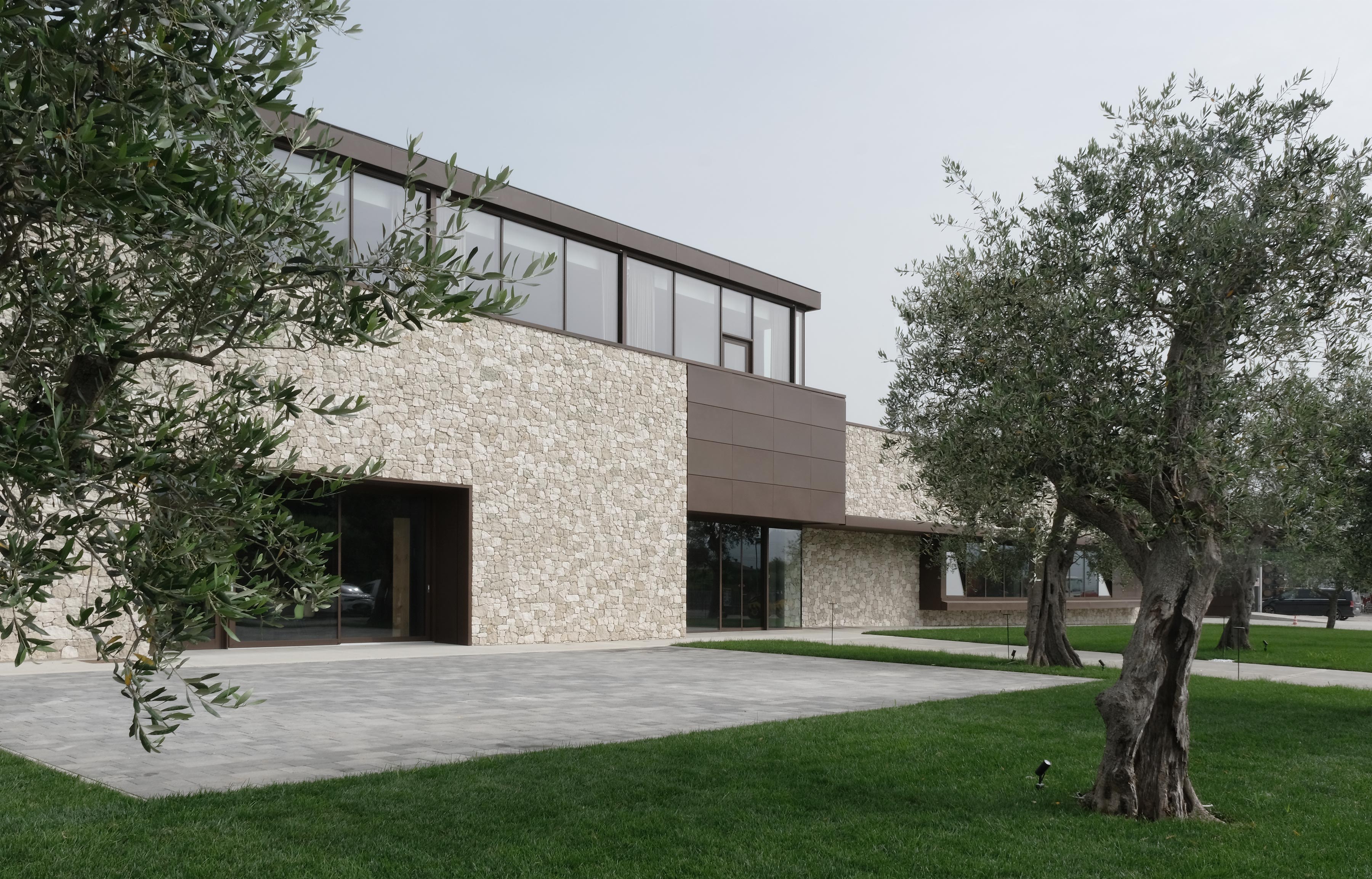 Il peso e la naturalezza della pietra si uniscono alla trasparenza del vetro e alla tecnica dell’acciaio a formare un dinamico diaframma tra volumi produttivi e paesaggio.