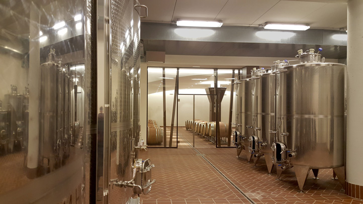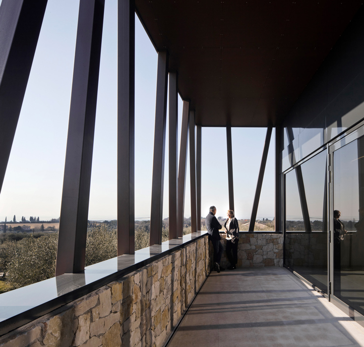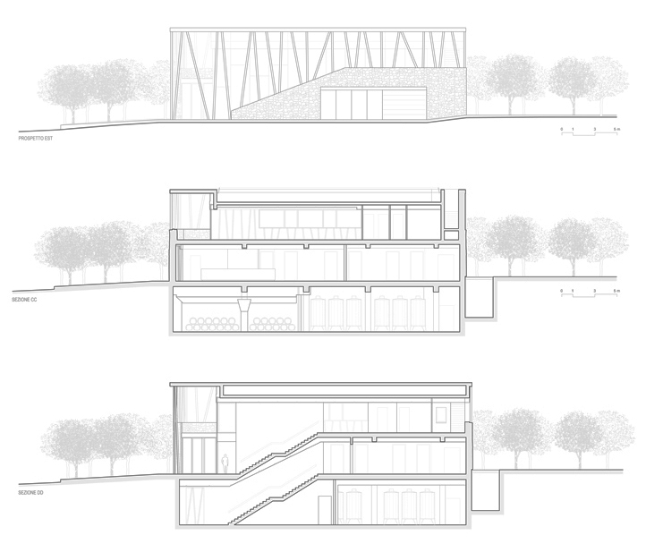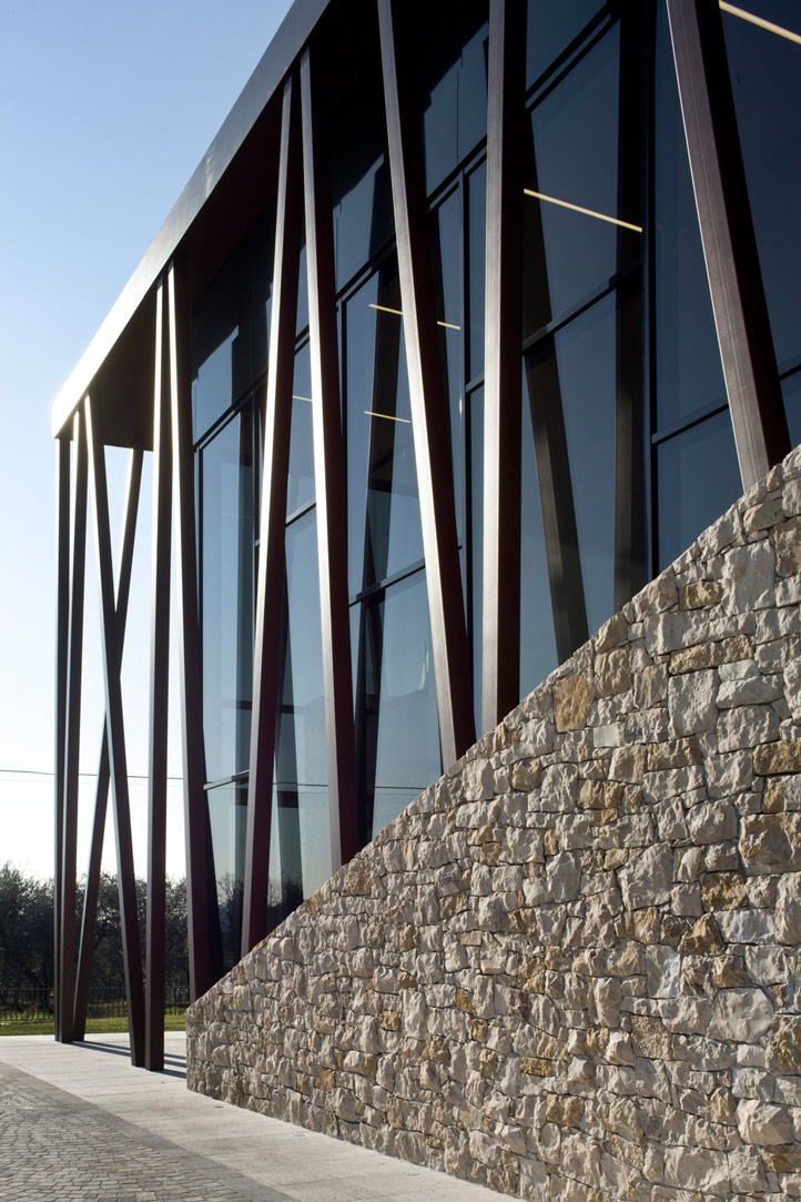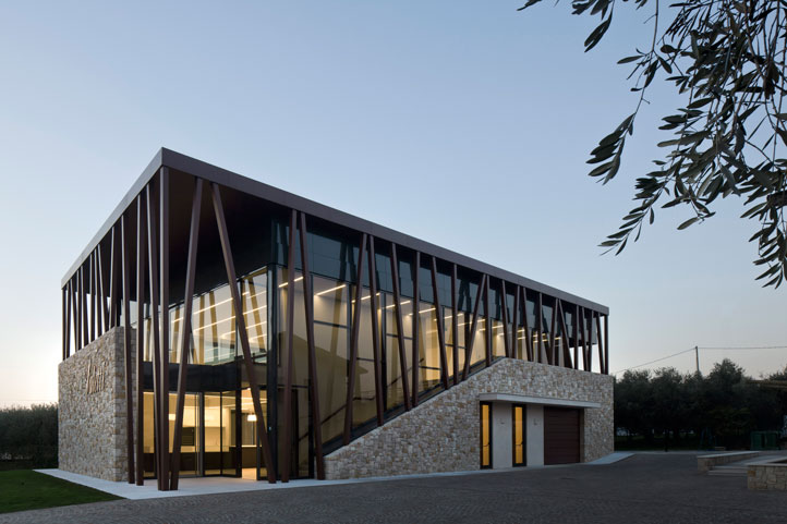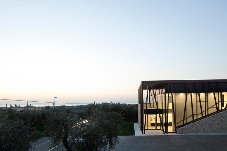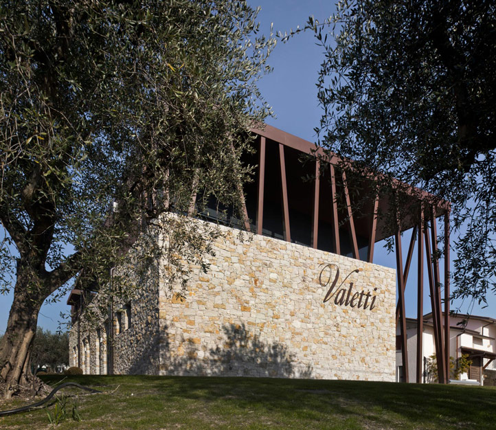 Azienda a conduzione familiare situata nel cuore della Zona Classica di produzione del Bardolino, in un territorio a forte vocazione turistica nella sponda sud del Lago di Garda, la Cantina Valetti da tre generazioni cerca il meglio dalle uve coniugando tradizione e tecnologia. La nuova cantina si compone di due livelli fuori terra per zone di vendita, degustazione ed imbottigliamento e un livello interrato per aree produttive; staccandosi dall’edificio esistente forma una corte chiarendo il rapporto di forza tra vecchio e nuovo. Il volume non cerca la mitigazione ma impone la sua presenza mettendo assieme diverse idee del costruire: il paradigma massivo della pietra e l’assemblaggio tettonico della struttura in acciaio, in una allusione formale e cromatica ad elementi tipici del paesaggio circostante, le marogne dei terrazzamenti e i pali di sostegno delle viti. La struttura in acciaio viene alleggerita grazie alla piega data ai sostegni esterni che seguono una logica “organica”; il muro in pietra si inclina verso lo spazio a doppia altezza dell’ingresso e accompagna il visitatore ai piani superiori dove si spalanca una splendida vista lago. L’edificio di notte diventa iconico; le linee luminose, come segni grafici, rivelano prospettive, scorci e volumi.