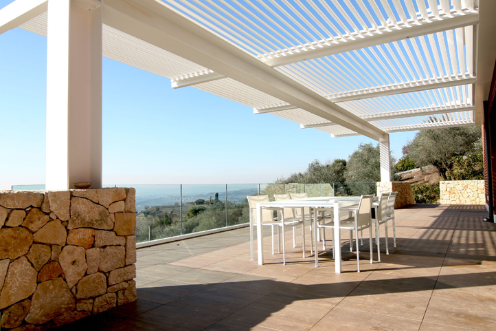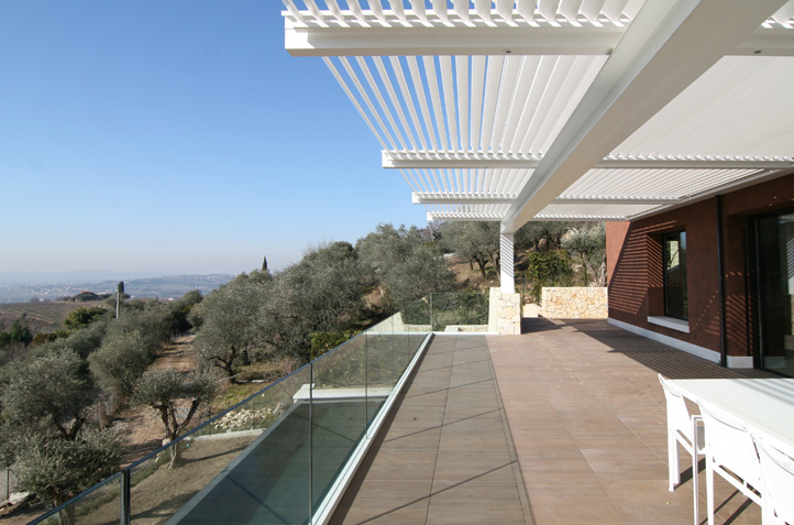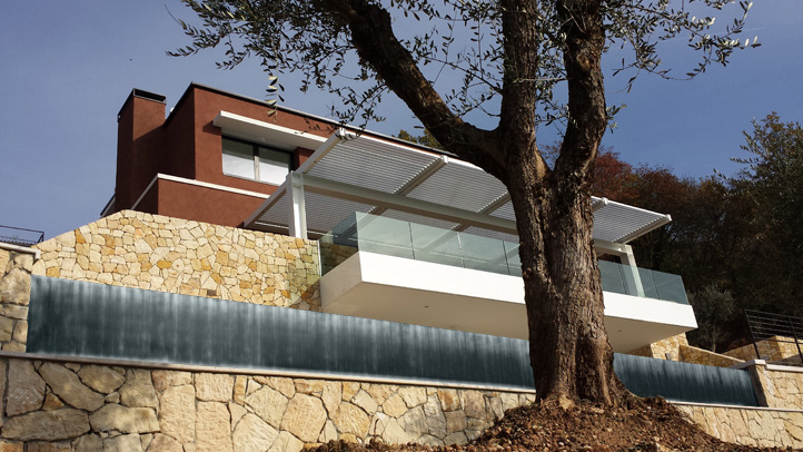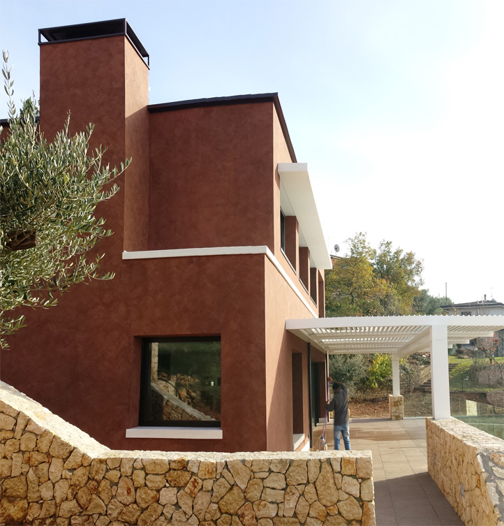 La particolare conformazione del terreno, costituito da terrazzamenti degradanti verso valle, e la vegetazione esistente hanno indotto ad una progettazione consapevole delle peculiarità del sito e quindi ad un inserimento del nuovo fabbricato tale da determinare il minor impatto ambientale possibile. L’obiettivo del progetto è quello di integrare la casa nelle balze esistenti del terreno; dalla vista da valle emerge dal verde il volume intonacato superiore di colore rosso mattone della zona notte mentre sono invisibili le parti di basamento rivestiti in pietra locale. Alla vista ravvicinata i livelli sono caratterizzati dalle linee orizzontali delle pensiline, dello sbalzo del terrazzo e dello sfioro scuro della piscina. Tutti i locali principali si affacciano verso la vista a sud, sono collegati a terrazze e giardini esterni dando l’impressione che la casa fluttui tra gli ulivi. La zona pranzo, soggiorno e cucina si aprono completamente sulla grande terrazza protetta da frangisole metallico. Agli abitanti, la casa offre la rara opportunità di un’immersione nella natura e nel paesaggio.