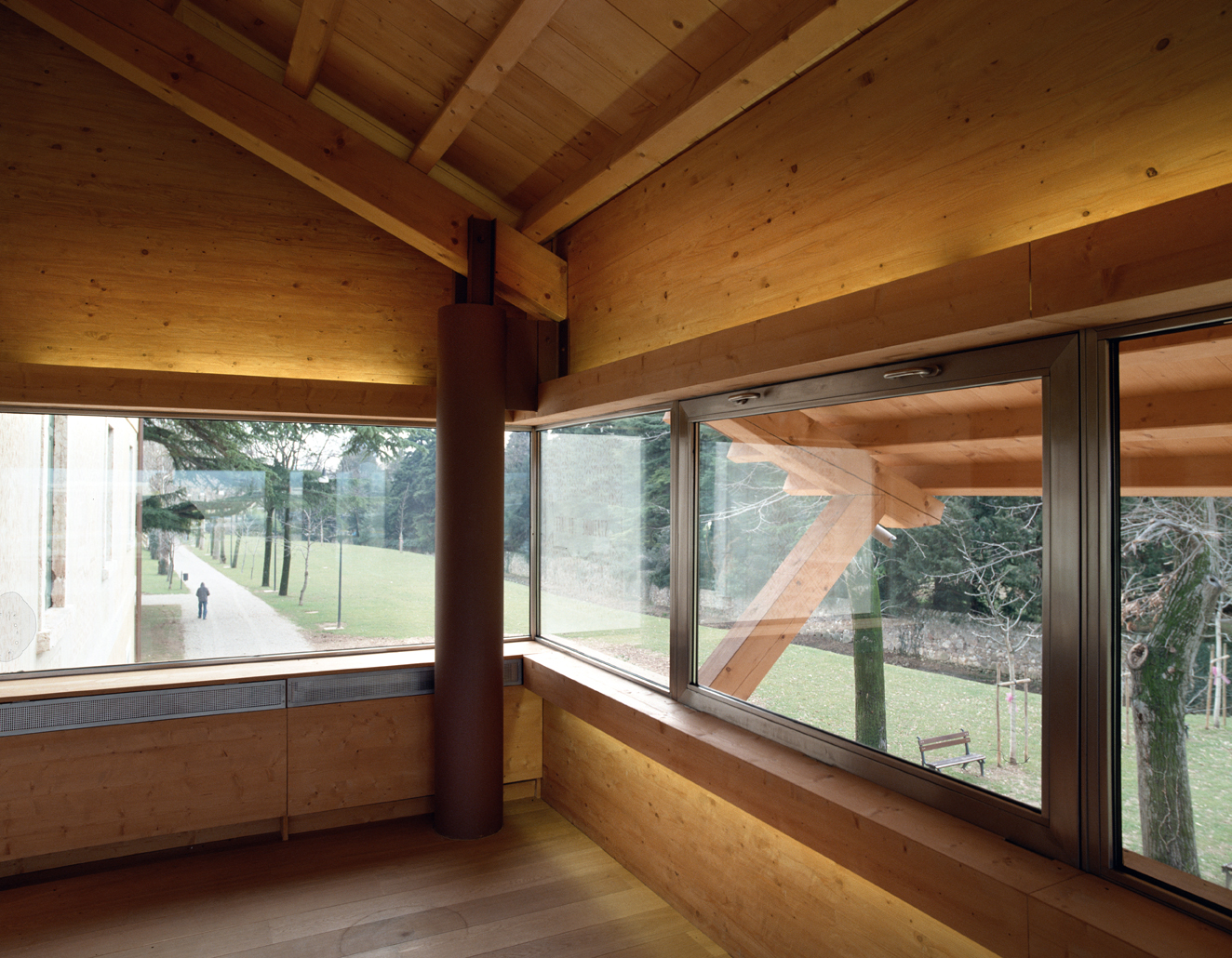 Il restauro delle facciate è stato condotto secondo criteri filologici, valorizzando le decorazioni storiche che testimoniano il passato della linea ferroviaria Verona Caprino–Garda, inattiva dagli anni Cinquanta. Parallelamente, la ricostruzione della tettoia risponde alle nuove esigenze funzionali, senza perdere il legame con la memoria spaziale e funzionale dell’edificio storico. Sono stati mantenuti i materiali, la forma e le dimensioni originali, ma reinterpretati con linee contemporanee: gli elementi lignei a falde, capriate e saette sostengono ampie sporgenze che ombreggiano le nuove sale della biblioteca. La sala conferenze, al piano terra, si caratterizza per le pareti vetrate che creano continuità tra interno ed esterno, evocando l’atmosfera della vecchia sala d’attesa. Al piano superiore, la finestra a nastro della sala di lettura offre uno sguardo aperto sulla vallata, evocando l’esperienza del viaggio in treno.