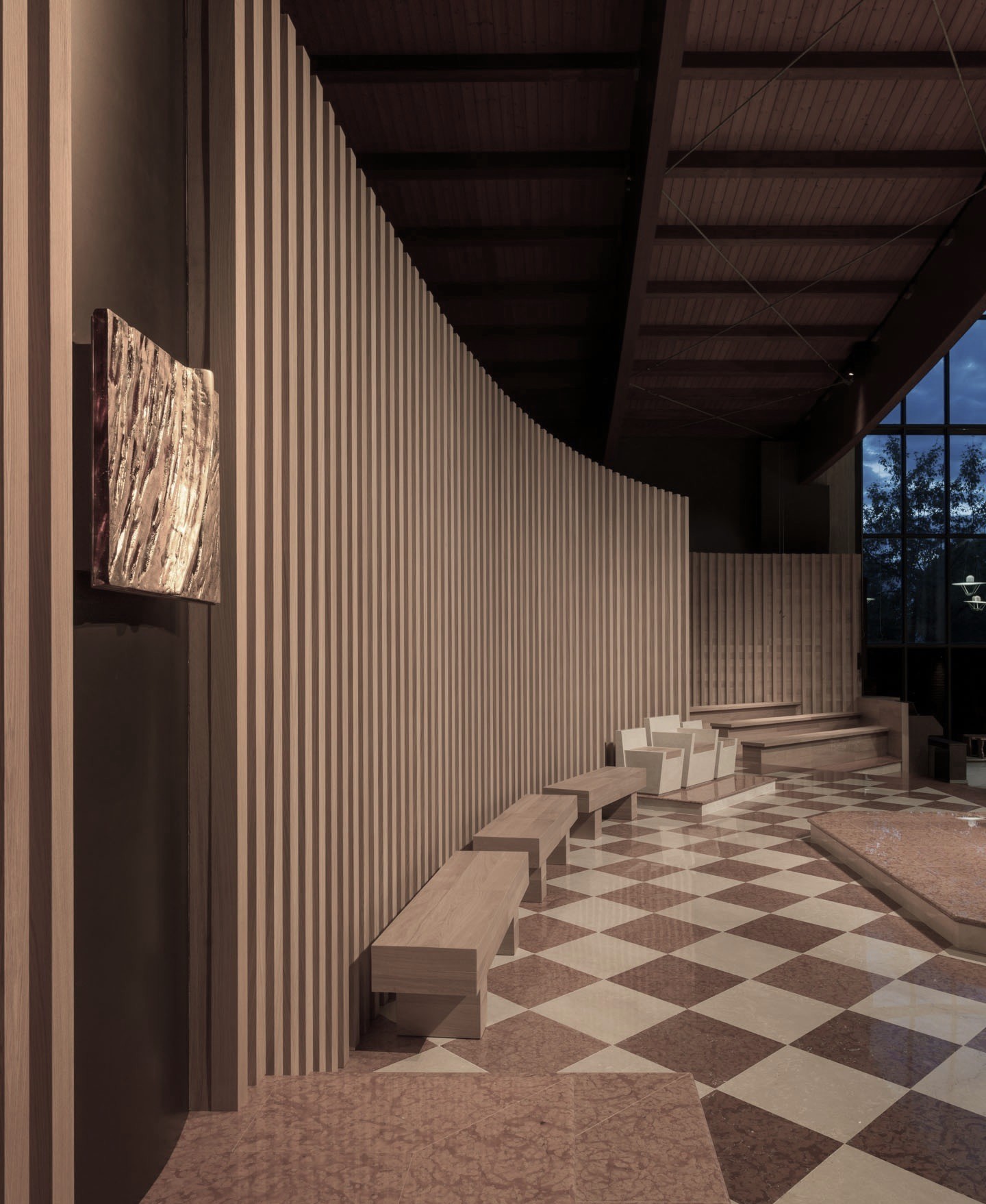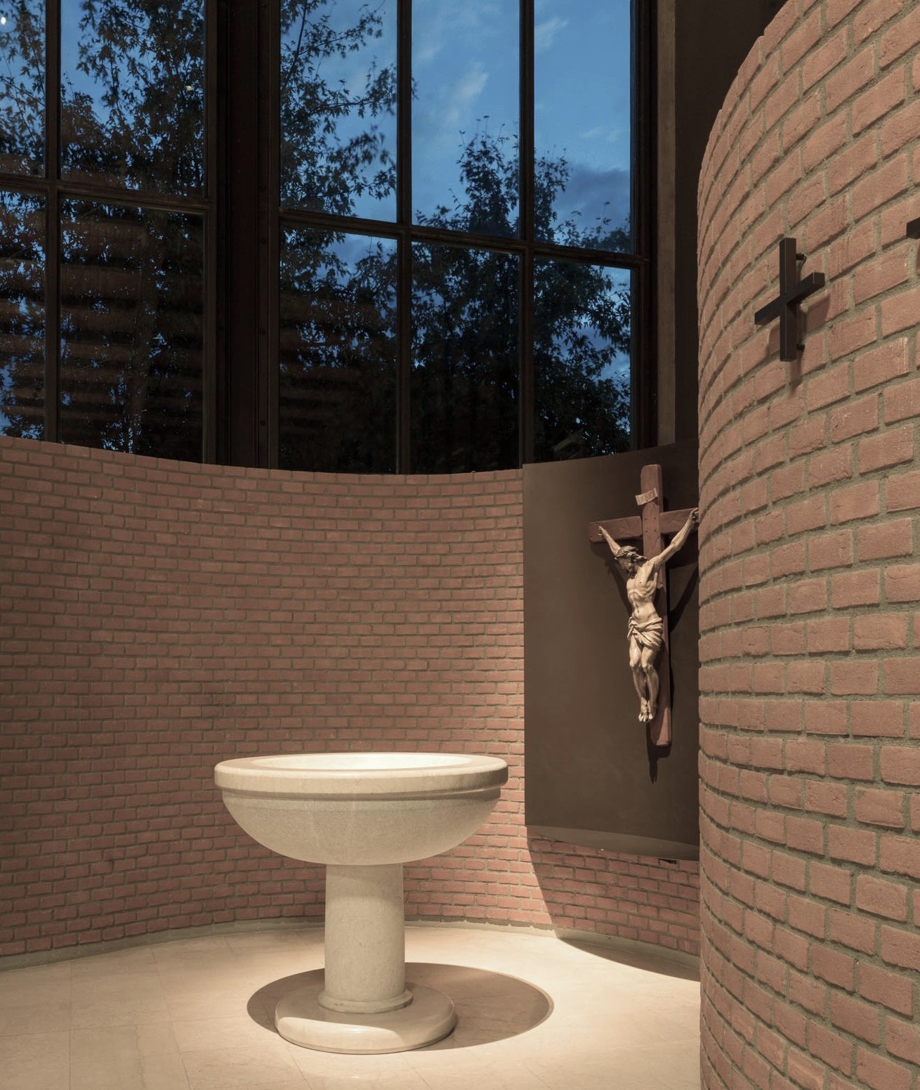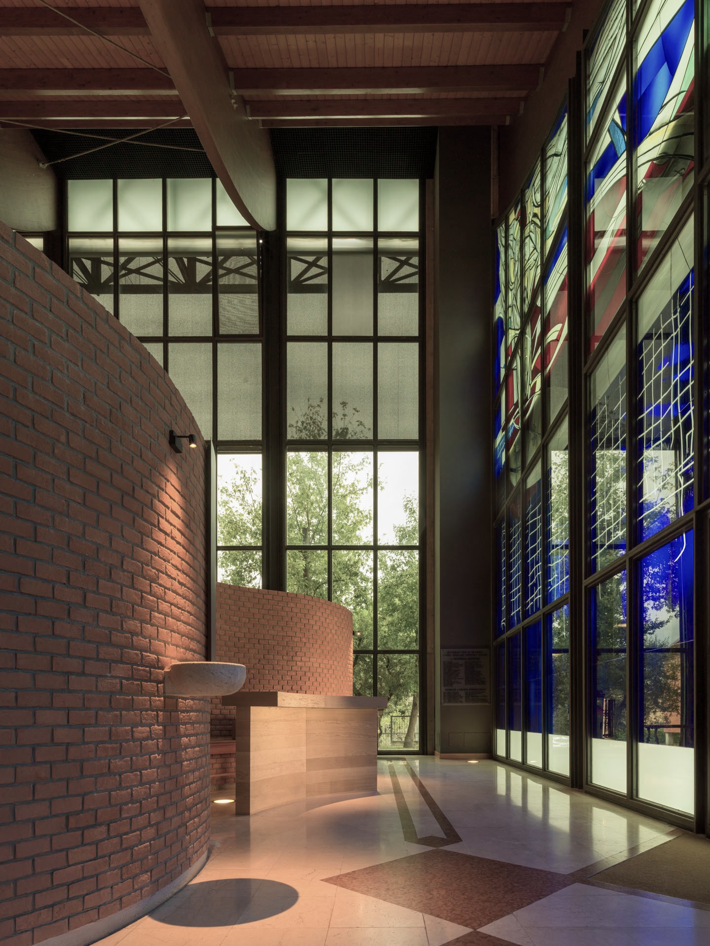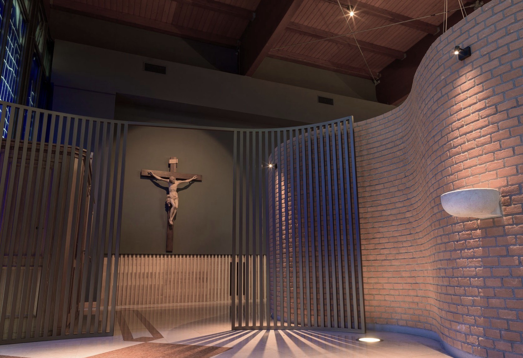 L’intero progetto si fonda sulla ricerca di una dimensione sacra anche all’interno di un ambiente contemporaneo e complesso, caratterizzato da geometrie variabili ed ampie superfici vetrate. L’equilibrio perseguito è stato raggiunto mediante la sintesi tra i materiali – vetro, marmo, mattoni, legno, elementi metallici e intonaci scuri - ed illuminazione “significante”. Il risultato è un’atmosfera intensa e coerente, in cui tutti gli elementi risultano integrati e chiaramente leggibili, favorendo raccoglimento e spiritualità senza rinunciare a modernità e funzionalità.