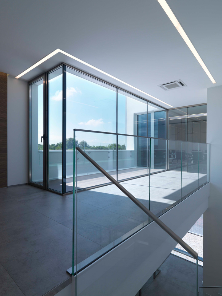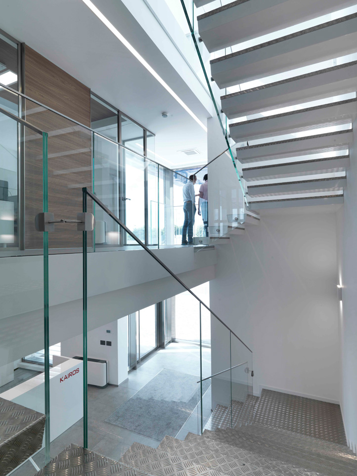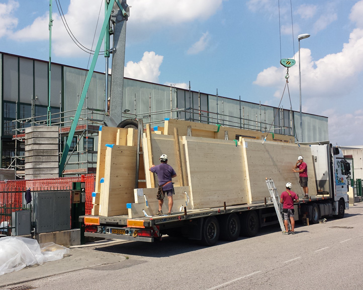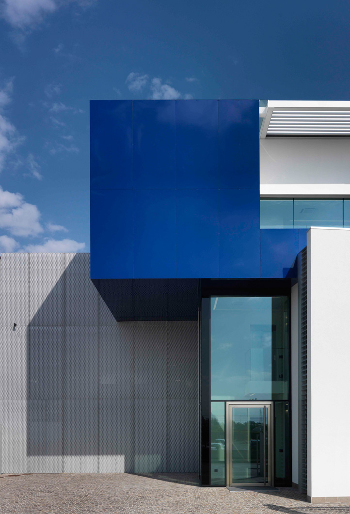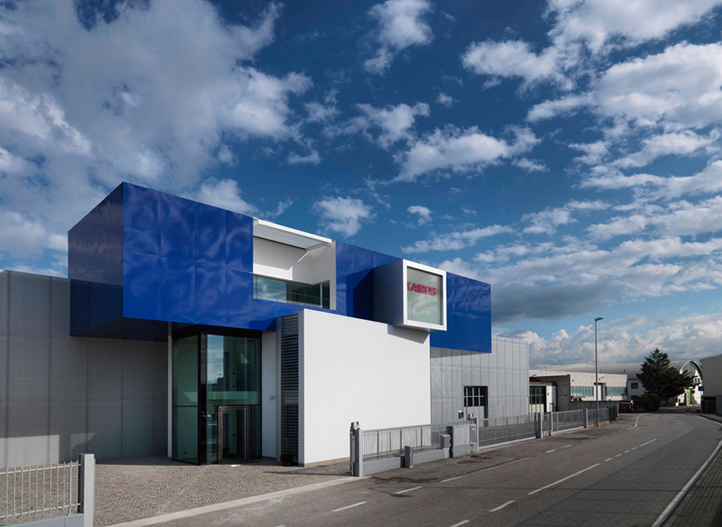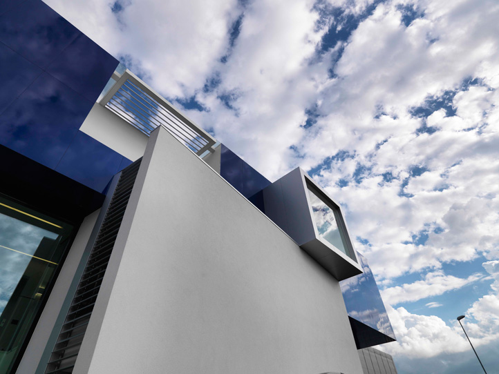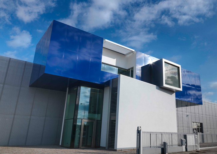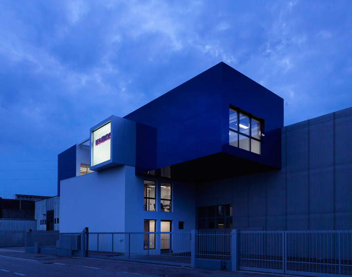 La particolare forma a T dell’edificio e l’approccio progettuale ecosostenibile ha portato alla scelta dell’edificazione con 79 pannelli strutturali in legno multistrato X-lam: il montaggio è stato effettuate da quattro uomini in meno di tre settimane nel mese di Agosto 2014 per non bloccare l’attività aziendale. Il volume superiore, rivestito in pannelli di alluminio blu lucido, assieme a un efficace camouflage del capannone preesistente cambia completamente il volto del contesto, domina la periferia industriale circostante conferendo nuova identità all’azienda. Il controllo di tutto il sistema costruttivo, dai sistemi di coibentazione alle schermature solari, dal riscaldamento elettrico a pavimento in metallo amorfo al controllo della qualità dell’aria interna con recupero del calore, dall’impiego di fonti rinnovabili al sistema di illuminazione principalmente a led permette un notevole contenimento dei consumi: insieme tecnologia, sostenibilità ed efficienza energetica.