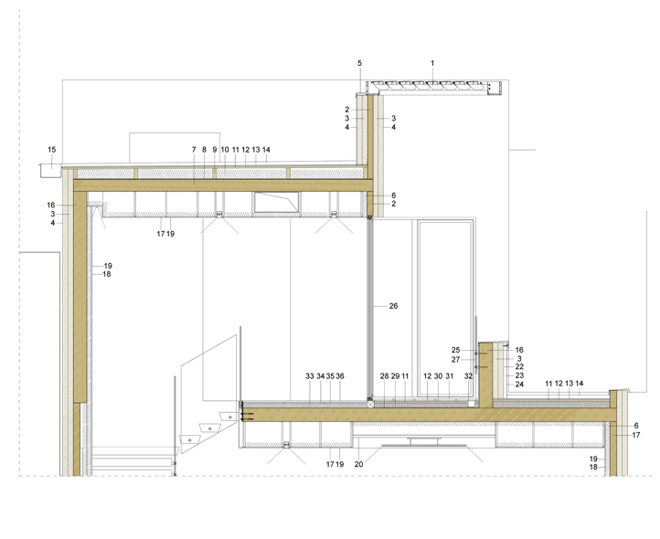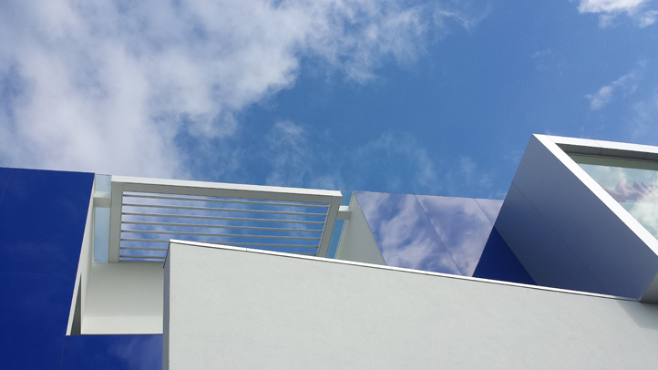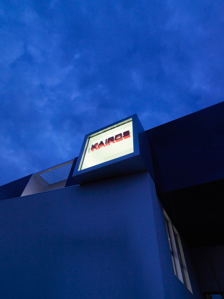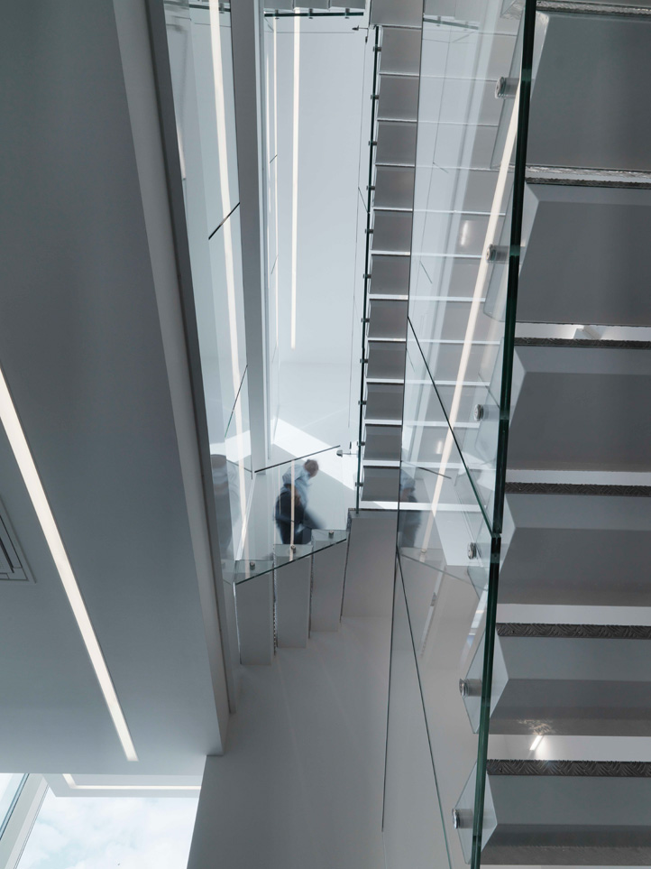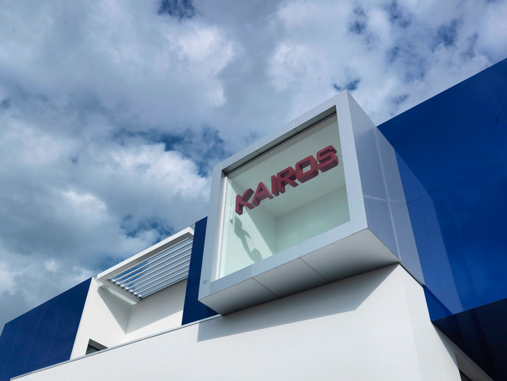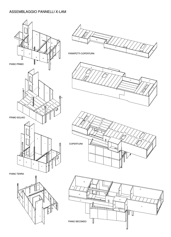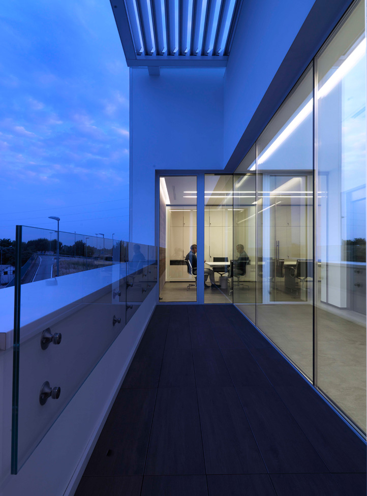 La particolare forma a T dell’edificio e l’approccio progettuale ecosostenibile ha portato alla scelta dell’edificazione con 79 pannelli strutturali in legno multistrato X-lam: il montaggio è stato effettuate da quattro uomini in meno di tre settimane nel mese di Agosto 2014 per non bloccare l’attività aziendale. Il volume superiore, rivestito in pannelli di alluminio blu lucido, assieme a un efficace camouflage del capannone preesistente cambia completamente il volto del contesto, domina la periferia industriale circostante conferendo nuova identità all’azienda. Il controllo di tutto il sistema costruttivo, dai sistemi di coibentazione alle schermature solari, dal riscaldamento elettrico a pavimento in metallo amorfo al controllo della qualità dell’aria interna con recupero del calore, dall’impiego di fonti rinnovabili al sistema di illuminazione principalmente a led permette un notevole contenimento dei consumi: insieme tecnologia, sostenibilità ed efficienza energetica.