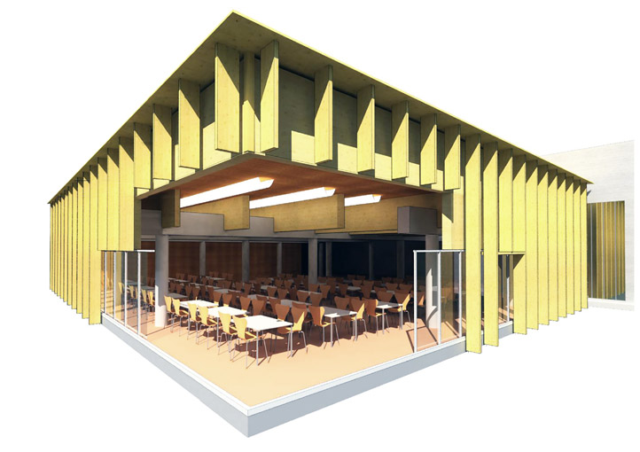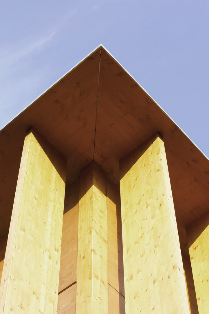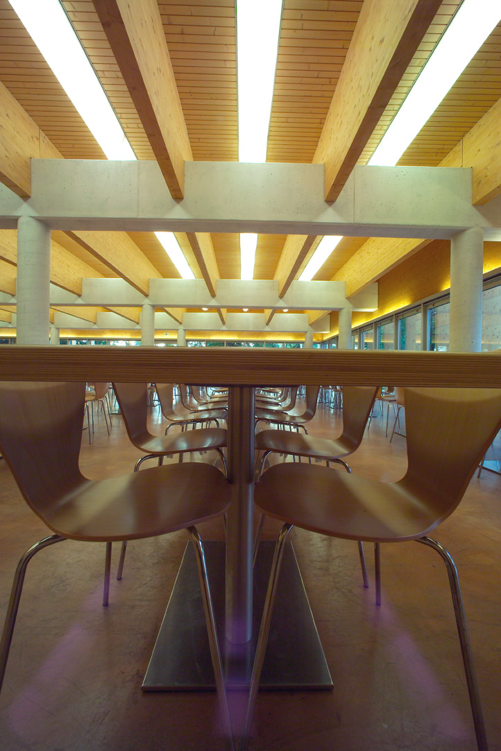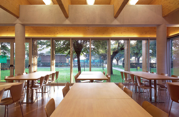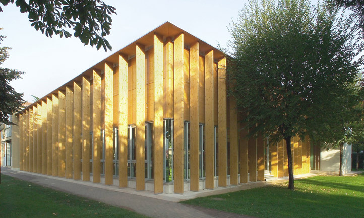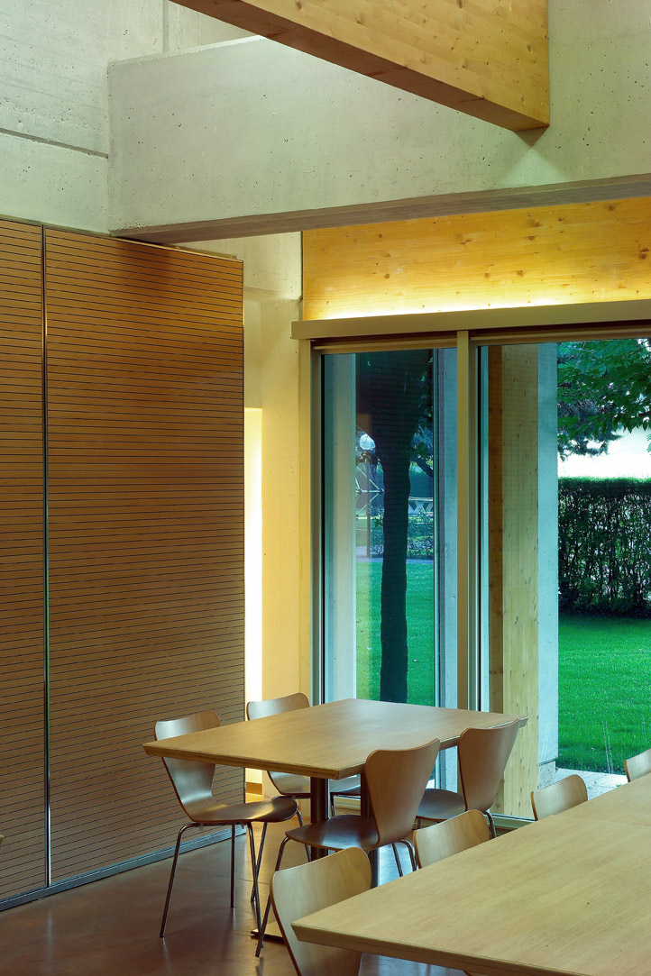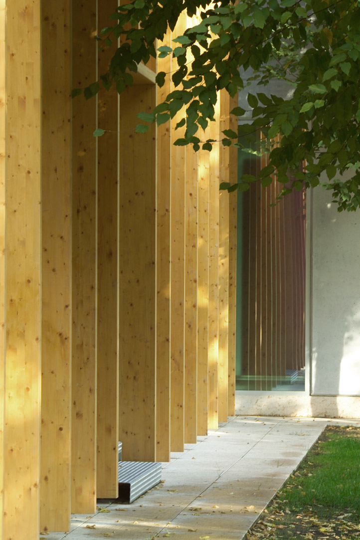 Il tema affrontato è quello del padiglione inserito nel verde. I materiali impiegati sono principalmente legno, calcestruzzo e vetro; le lavorazioni ridotte all’essenziale suggeriscono valori naturali. I prospetti esterni sono caratterizzati da assi verticali in legno lamellare, che schermano la facciata ed offrono una protezione moderna e simbolica. Gli interni sono stati studiati in maniera da garantire massimo confort acustico e luminoso all’utente.