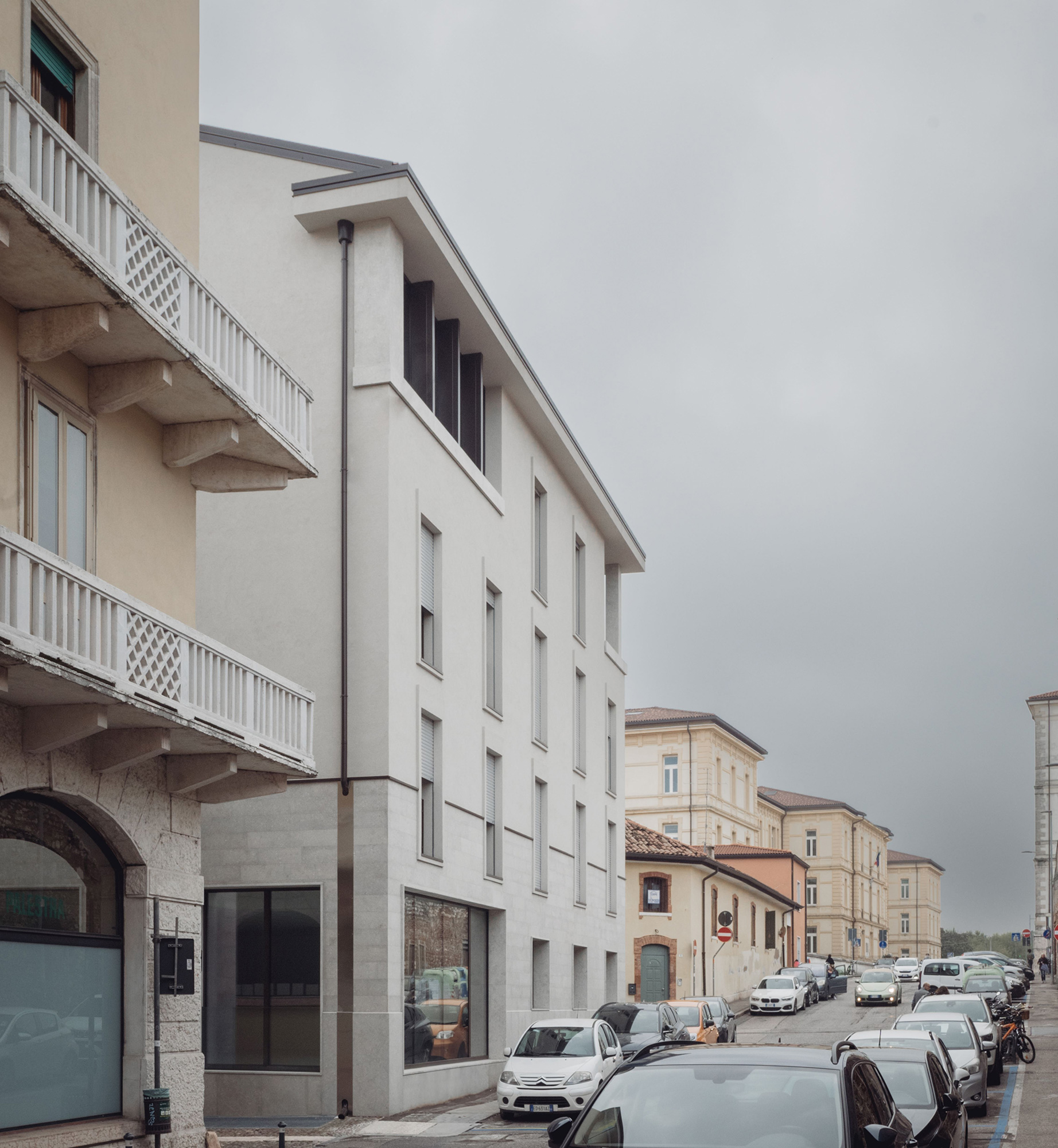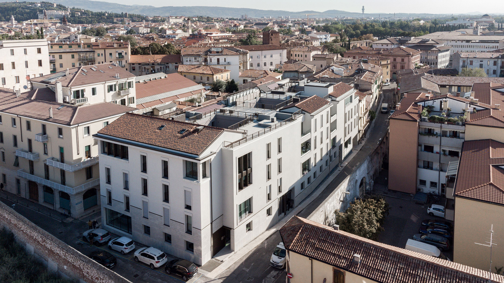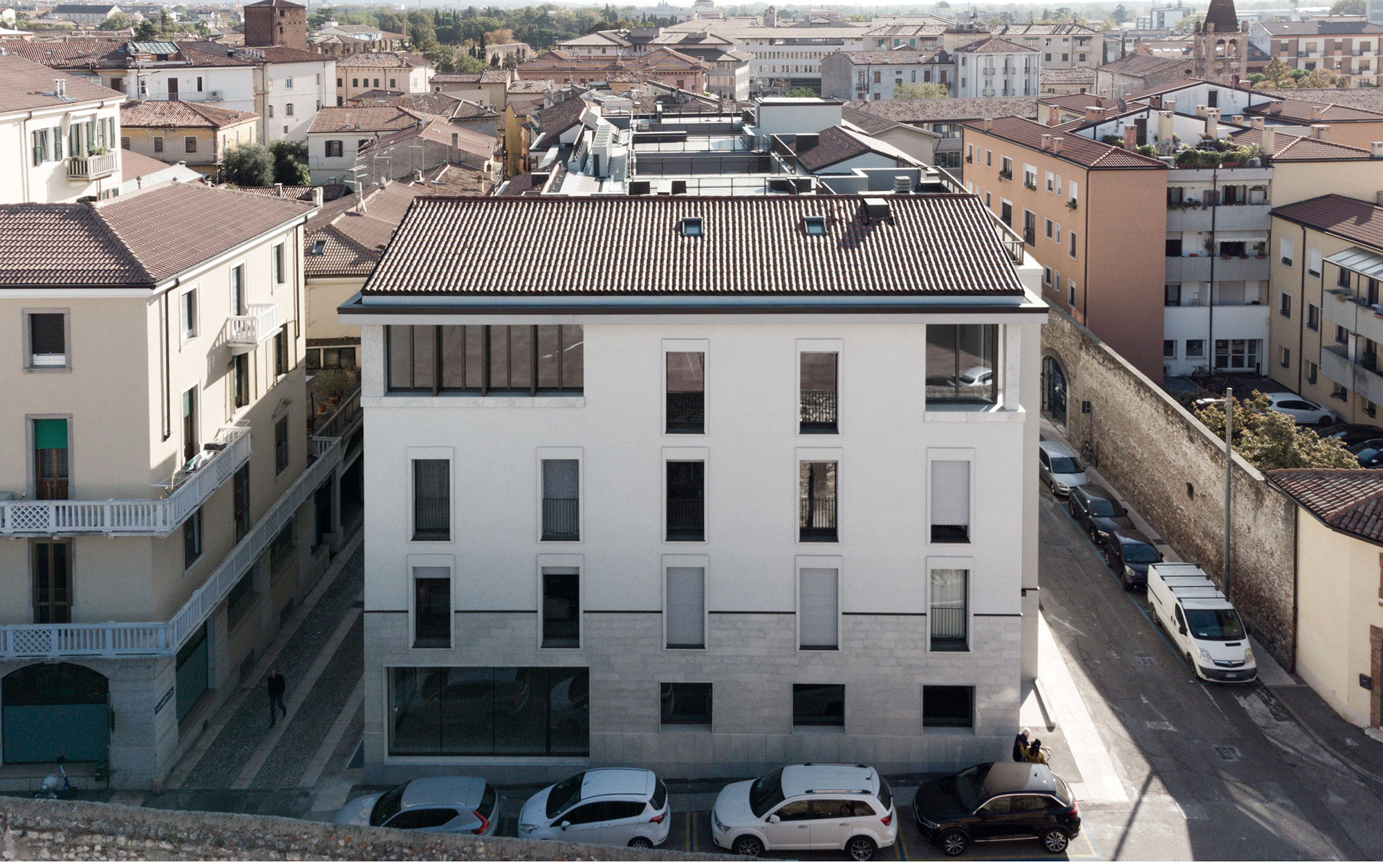Palazzo Mastino ridefinisce parte di un isolato del quartiere di Cittadella a Verona. Costruito in luogo di un’officina meccanica dismessa, diventata nel tempo discoteca e infine sala bingo, l’intervento propone una rilettura aggiornata della compatta cortina edilizia della città circostante. Il complesso, che ospita due piani di parcheggi interrati, uffici nella testata del piano terra, residenze per complessivi 50 appartamenti con diversi tagli di alloggi, si imposta intorno a tre corti interne e ha andamento curvilineo per seguire il tracciato urbano preesistente.