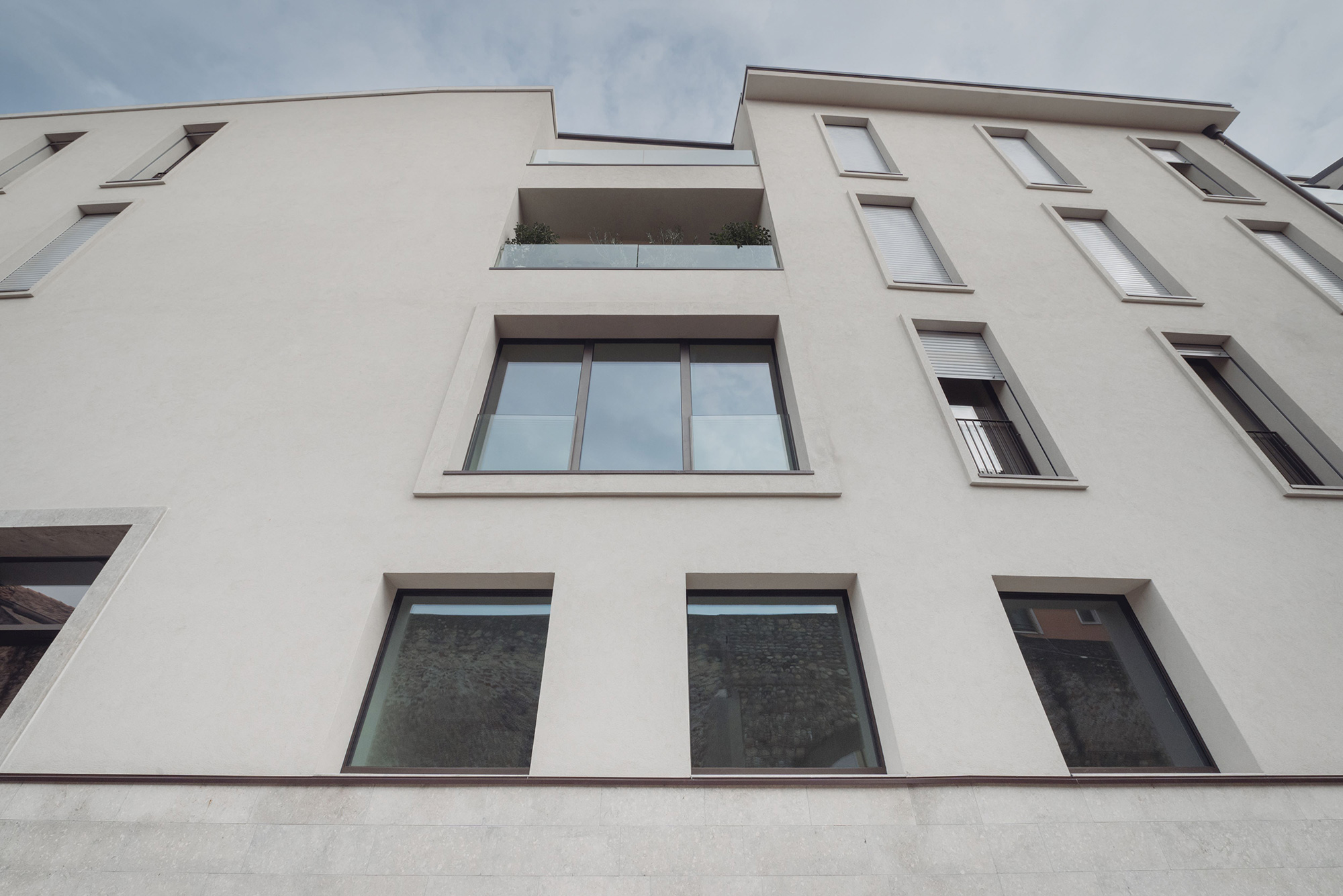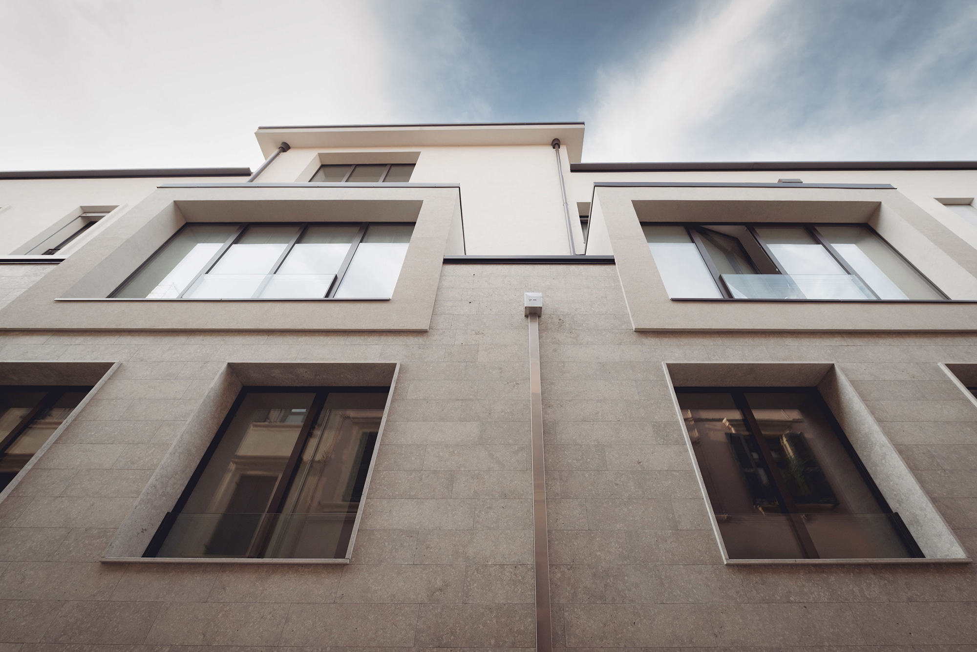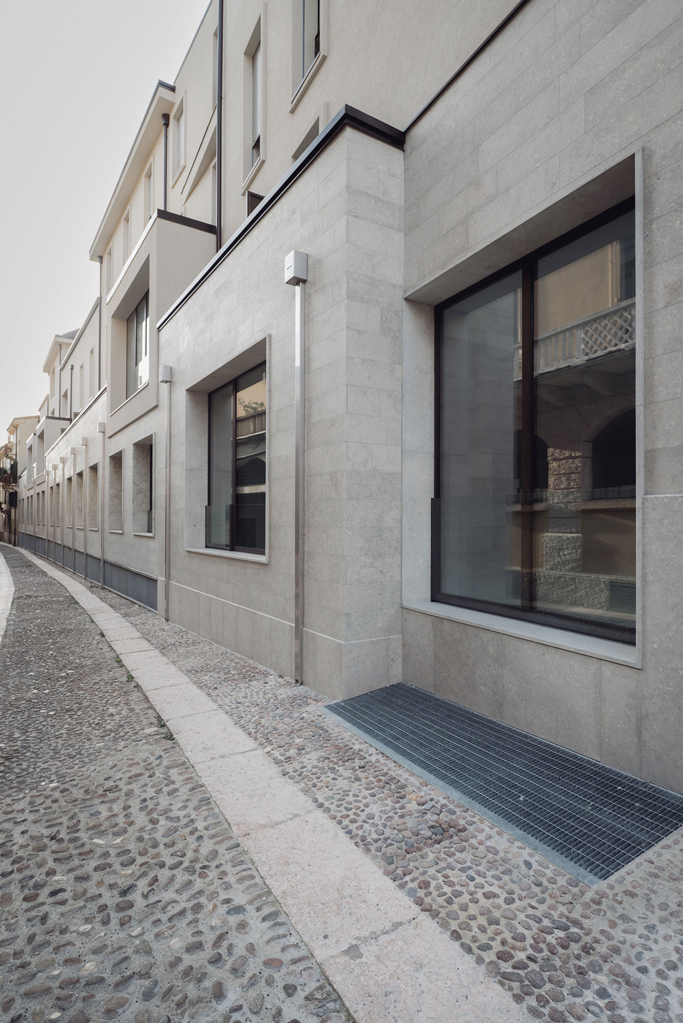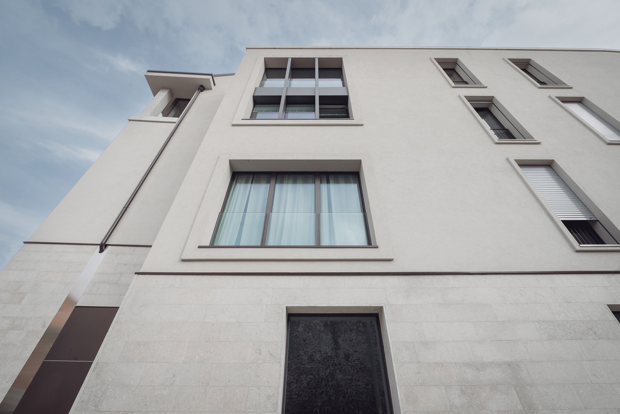 La tipologia costruttiva, strutture in cemento armato con pareti esterne in calcestruzzo areato isolante e pareti interne in cartongesso, ha soddisfatto sia la sostenibilità economica dell’intervento che le crescenti esigenze di comfort abitativo, efficienza energetica e flessibilità per il futuro. La scelta attenta dei materiali e delle superfici acusticamente efficaci garantiscono comfort e benessere. Le facciate sono rivestite in cappotto comprese anche le cornici delle finestre che hanno diverse larghezze e profondità; l’intonaco è monocromatico di colore chiaro sullo stesso tono della Pietra di Vicenza dell’attacco a terra. Sulle coperture sono installati tutti gli impianti tecnologici – pompe di calore e fotovoltaico - opportunamente integrati e facilmente raggiungibili per le manutenzioni.