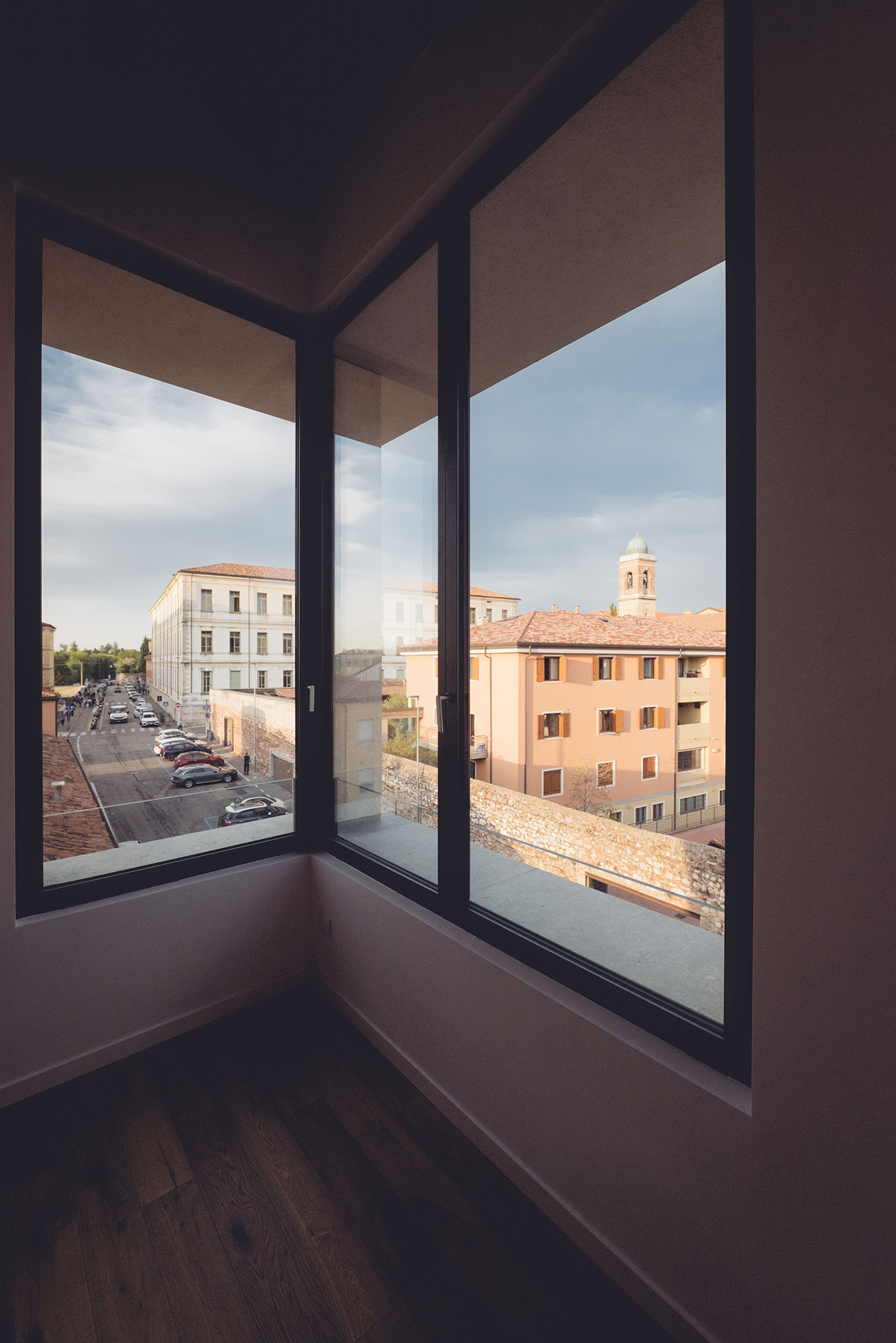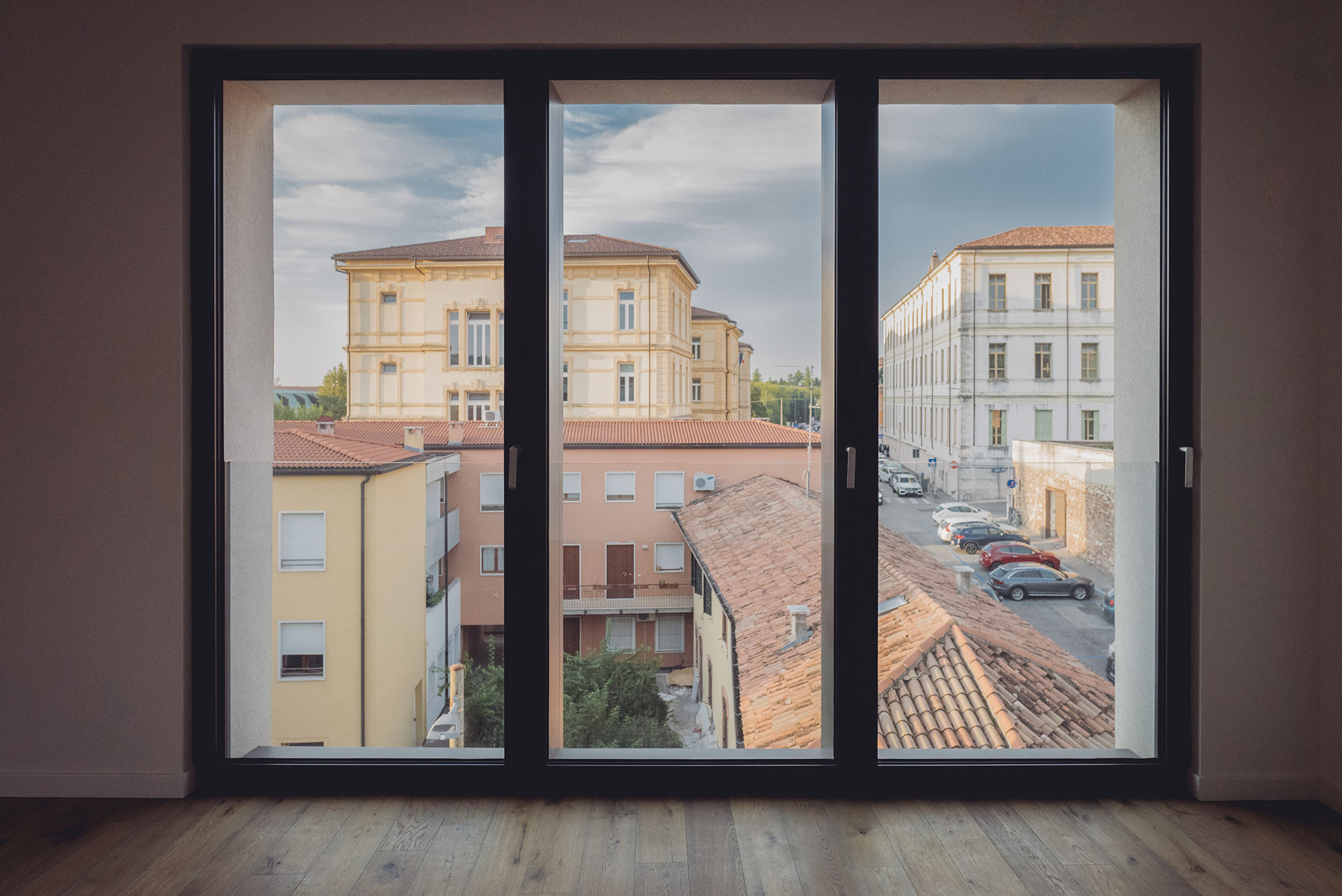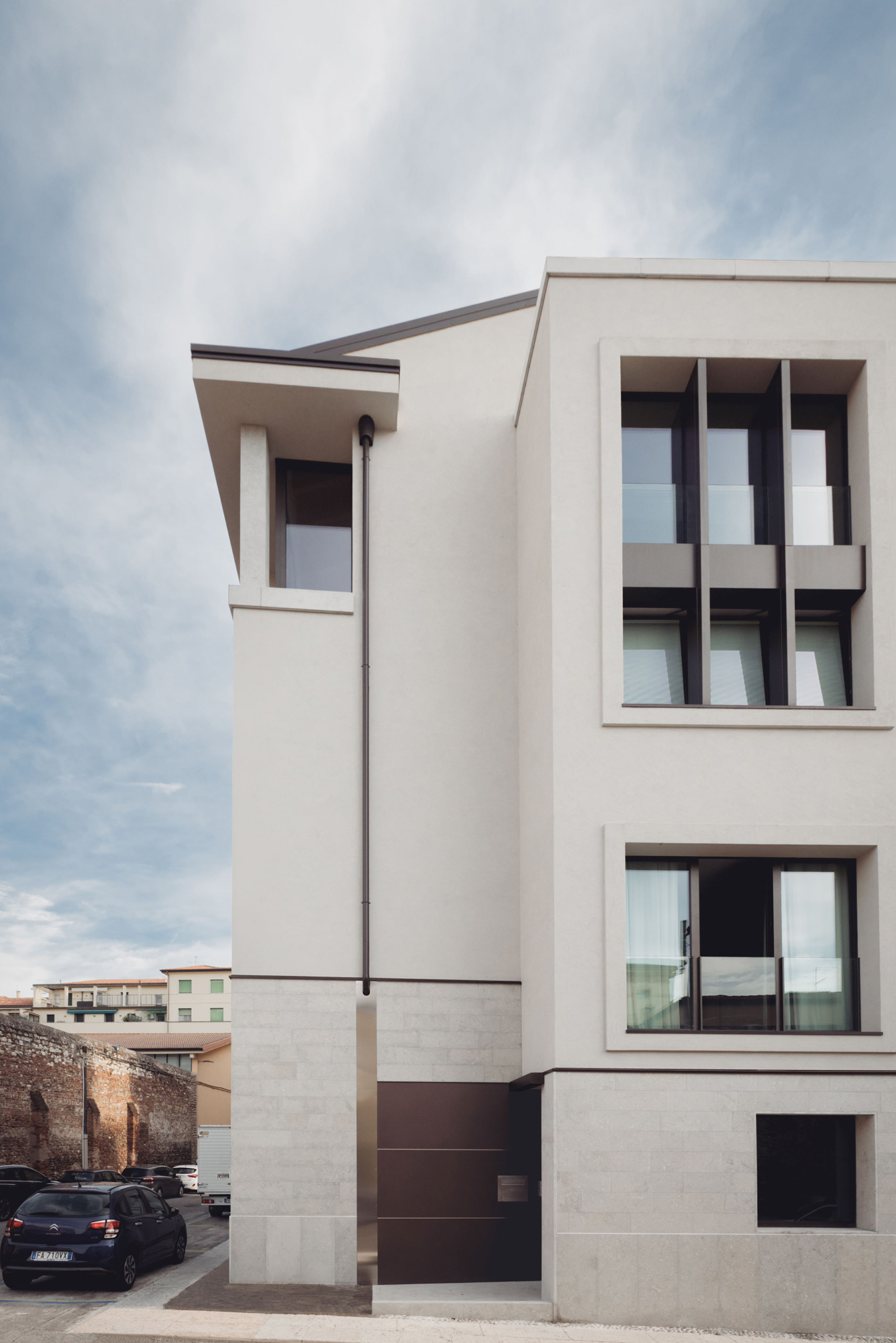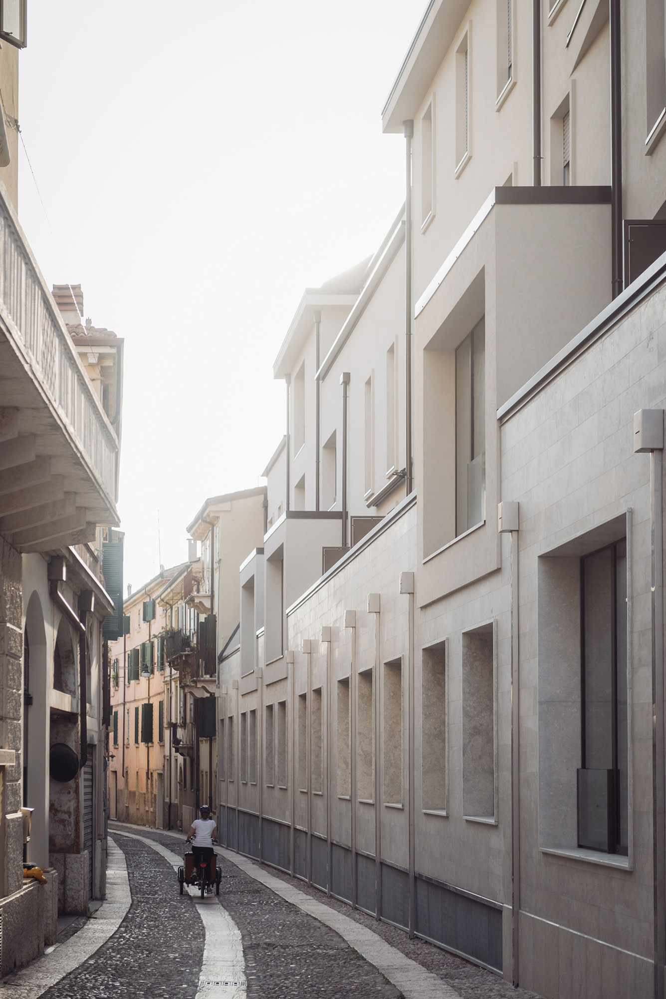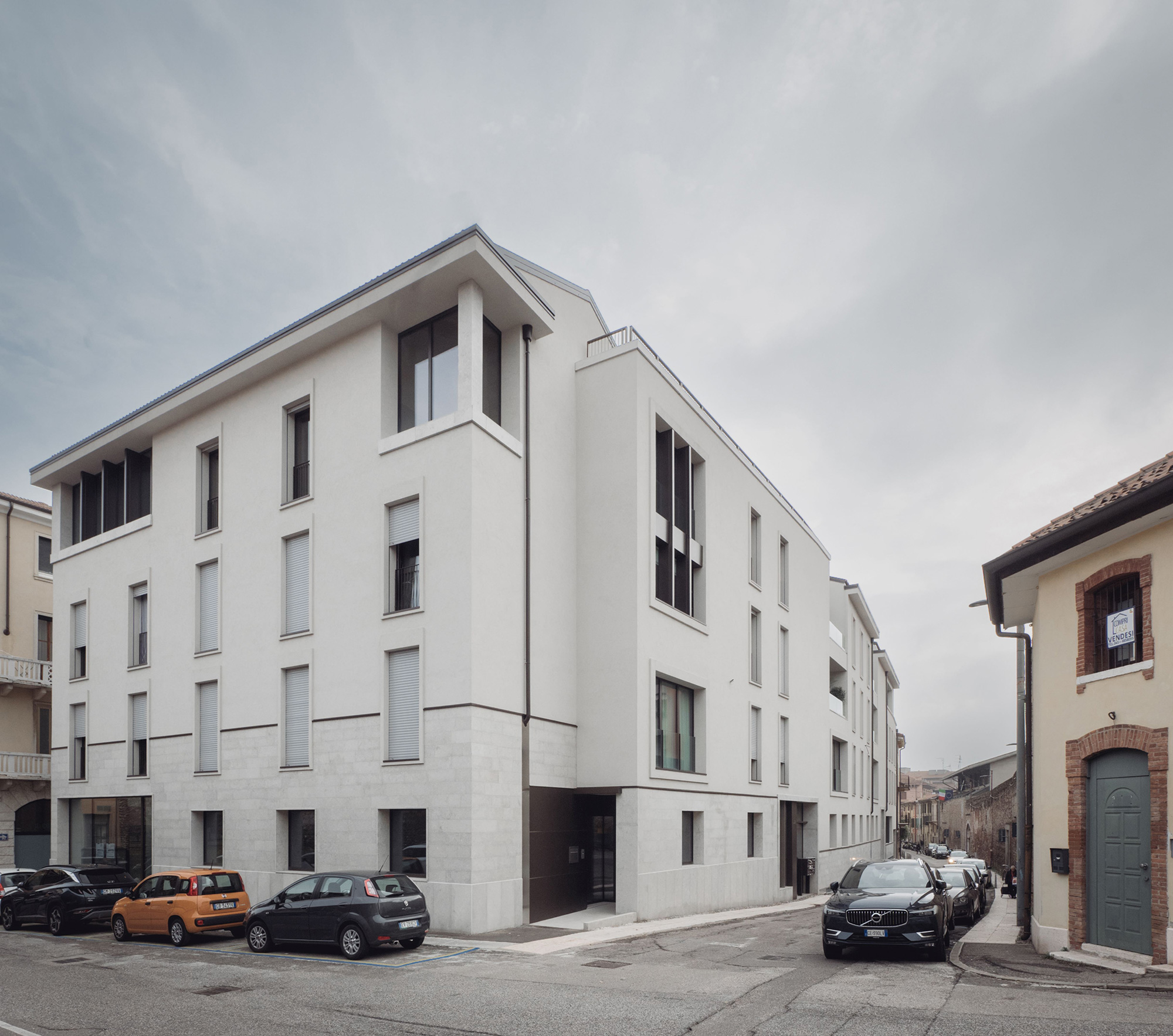 La tipologia costruttiva, strutture in cemento armato con pareti esterne in calcestruzzo areato isolante e pareti interne in cartongesso, ha soddisfatto sia la sostenibilità economica dell’intervento che le crescenti esigenze di comfort abitativo, efficienza energetica e flessibilità per il futuro. La scelta attenta dei materiali e delle superfici acusticamente efficaci garantiscono comfort e benessere. Le facciate sono rivestite in cappotto comprese anche le cornici delle finestre che hanno diverse larghezze e profondità; l’intonaco è monocromatico di colore chiaro sullo stesso tono della Pietra di Vicenza dell’attacco a terra. Sulle coperture sono installati tutti gli impianti tecnologici – pompe di calore e fotovoltaico - opportunamente integrati e facilmente raggiungibili per le manutenzioni.