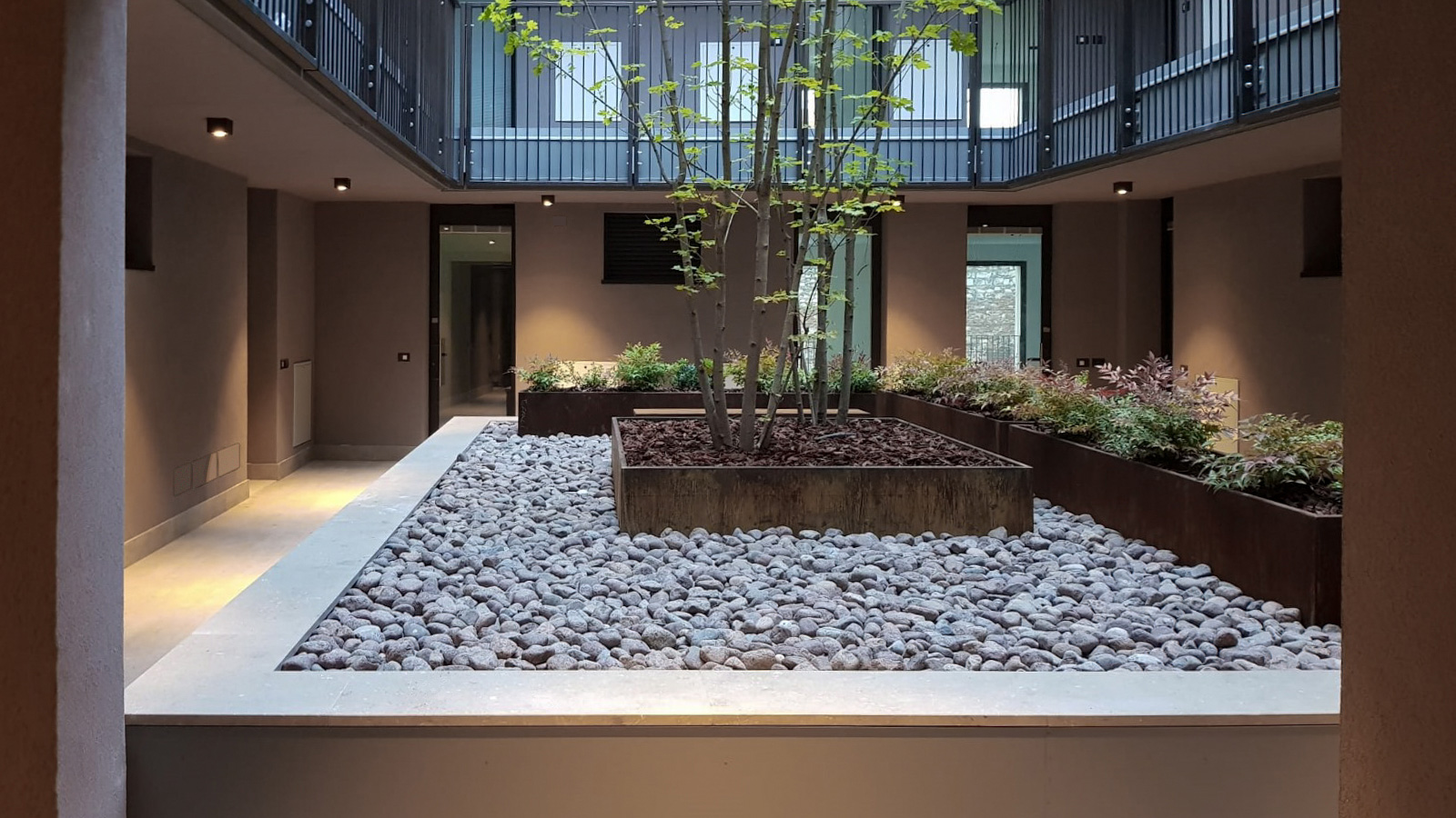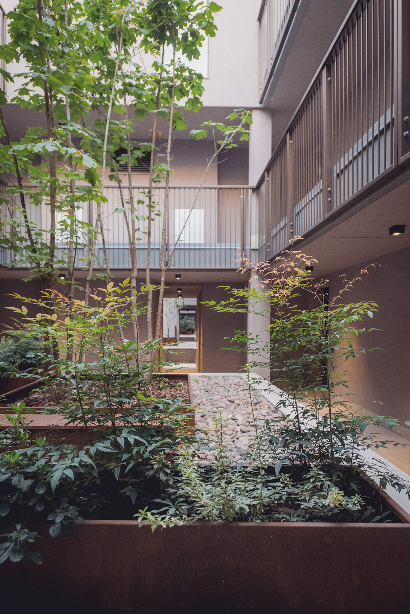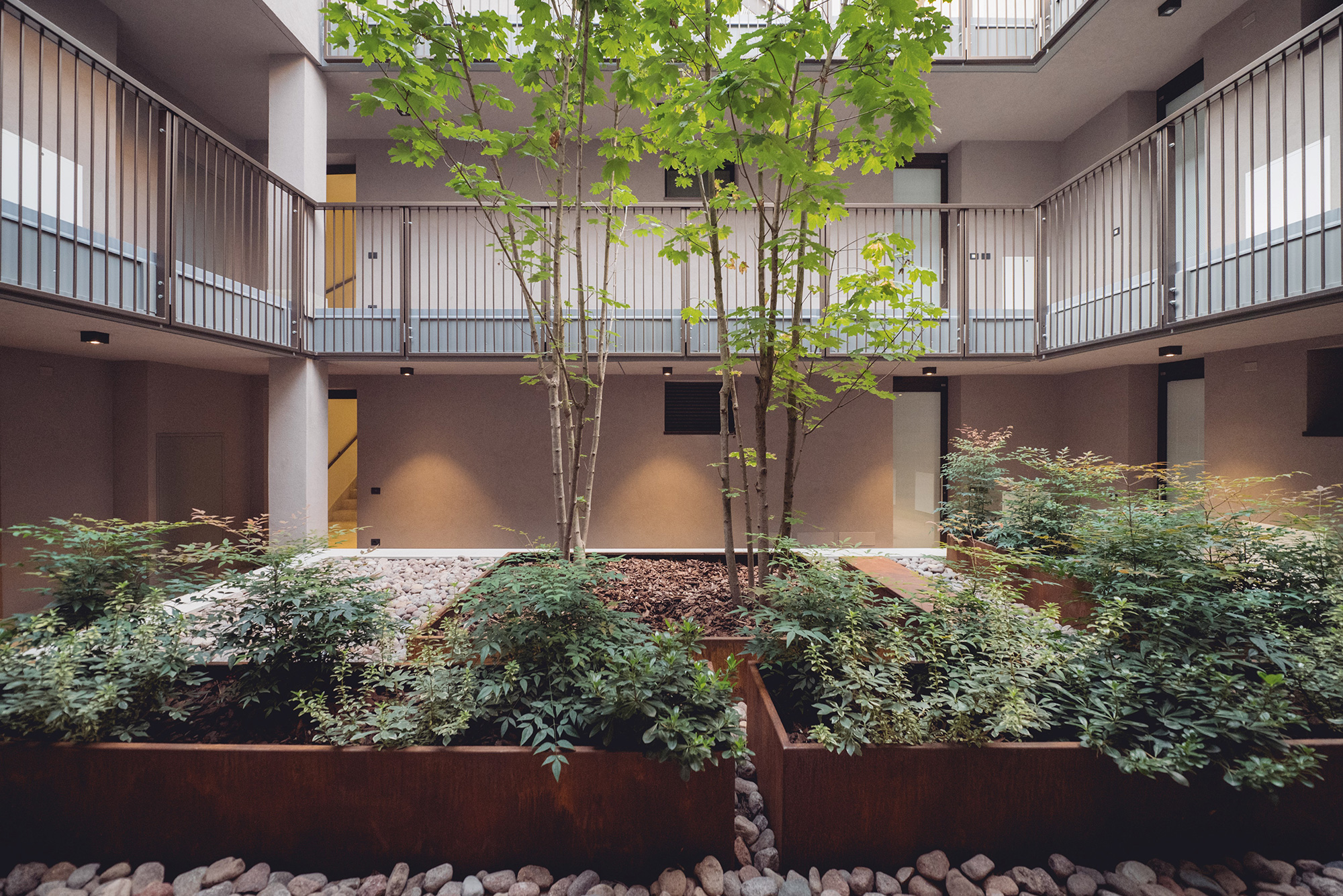 Alla discreta eleganza degli esterni, di cui l’intonaco chiaro e la zoccolatura in pietra grigia enfatizzano il carattere contemporaneo, si contrappone l’intimità degli interni. Qui il complesso si affaccia sulle corti interne che reinterpretano il tema delle case di ringhiera. Le corti, di fatto dei piccoli giardini pensili posti al piano primo, sono circondate da ballatoi di distribuzione dei bilocali e trilocali, logge e balconi che consentono il mantenimento di un microclima interno mettendo in atto strategie per la ventilazione passiva e il raffrescamento naturale. I cortili fungono da zona cuscinetto, proteggono gli spazi interni consentendo la ventilazione trasversale e migliorano la circolazione dell’aria. Questi spazi, silenziosi malgrado siano in centro città, per una questione di luce, colori, verde e materiali sono luoghi di pace e rilassatezza che aumentano la qualità della vita degli inquilini. Grazie alla distribuzione a ballatoio si è potuto far corrispondere il preciso e regolare ritmo delle facciate alle disposizioni più varie degli ambienti interni. All’ultimo piano si trovano i piani attici caratterizzati dall’ampia varietà di orientamenti con grandi vedute verso il paesaggio urbano.