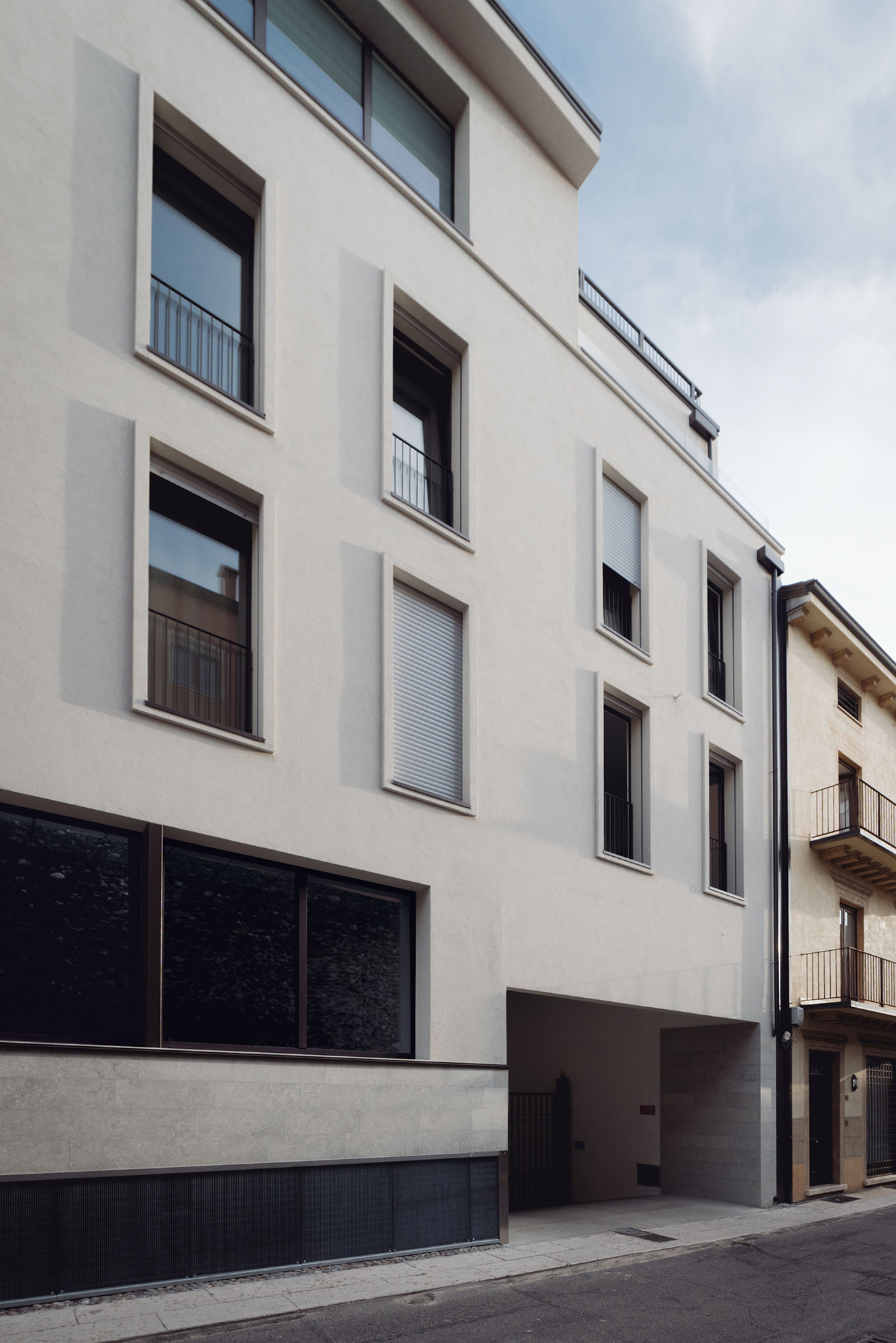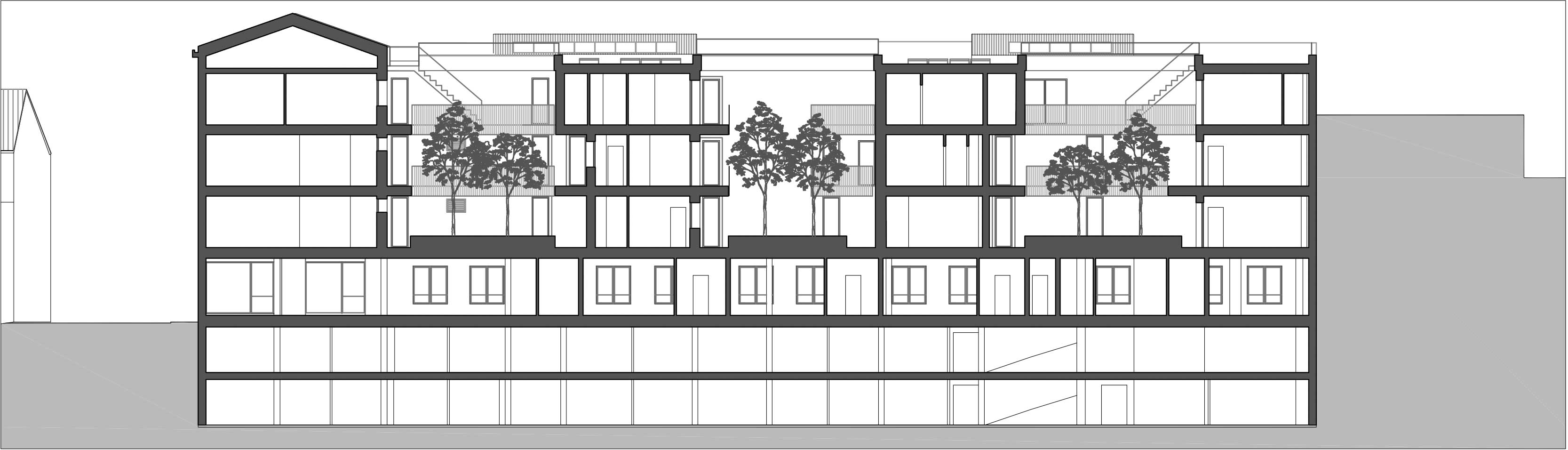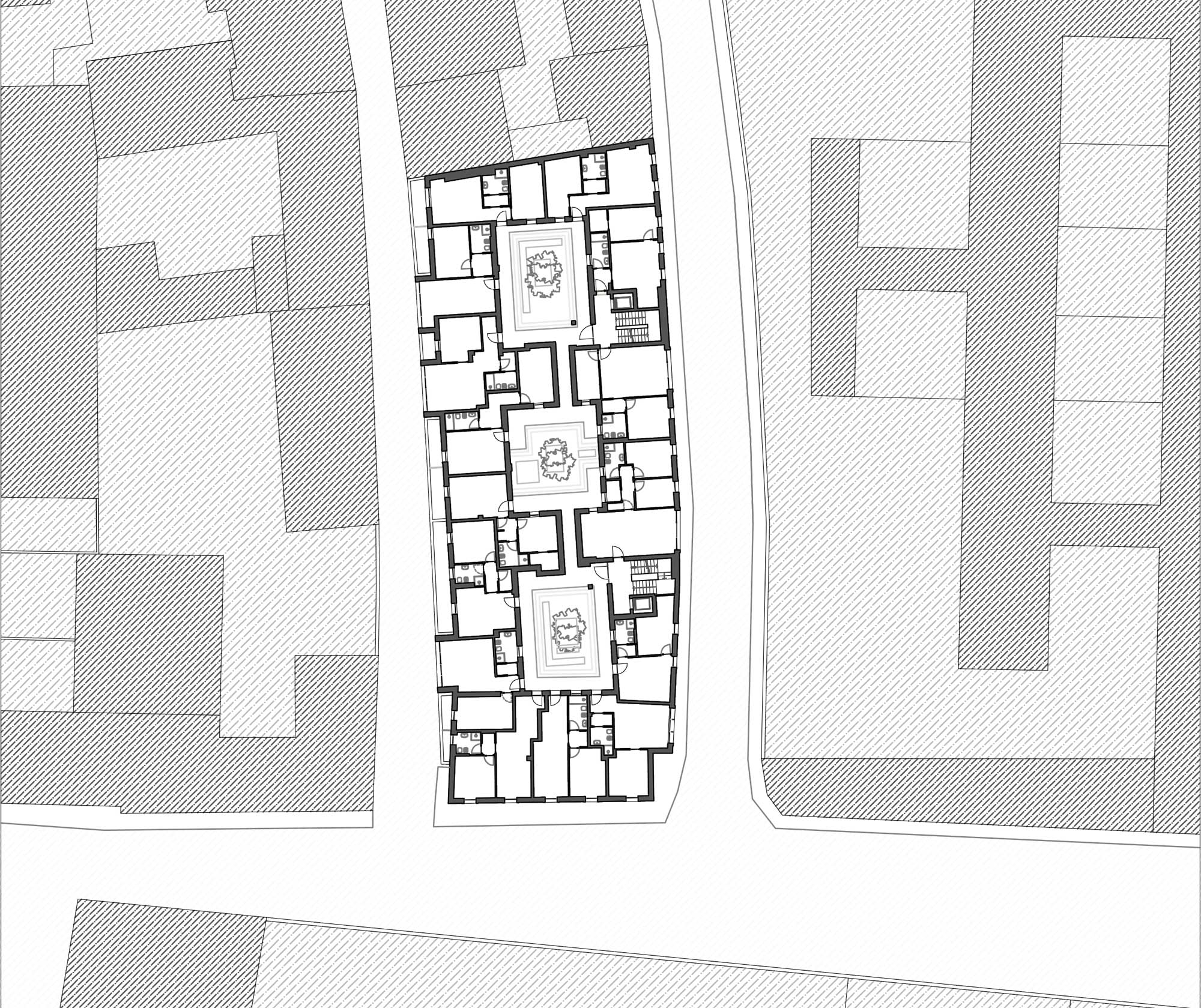 Alla discreta eleganza degli esterni, di cui l’intonaco chiaro e la zoccolatura in pietra grigia enfatizzano il carattere contemporaneo, si contrappone l’intimità degli interni. Qui il complesso si affaccia sulle corti interne che reinterpretano il tema delle case di ringhiera. Le corti, di fatto dei piccoli giardini pensili posti al piano primo, sono circondate da ballatoi di distribuzione dei bilocali e trilocali, logge e balconi che consentono il mantenimento di un microclima interno mettendo in atto strategie per la ventilazione passiva e il raffrescamento naturale. I cortili fungono da zona cuscinetto, proteggono gli spazi interni consentendo la ventilazione trasversale e migliorano la circolazione dell’aria. Questi spazi, silenziosi malgrado siano in centro città, per una questione di luce, colori, verde e materiali sono luoghi di pace e rilassatezza che aumentano la qualità della vita degli inquilini. Grazie alla distribuzione a ballatoio si è potuto far corrispondere il preciso e regolare ritmo delle facciate alle disposizioni più varie degli ambienti interni. All’ultimo piano si trovano i piani attici caratterizzati dall’ampia varietà di orientamenti con grandi vedute verso il paesaggio urbano.