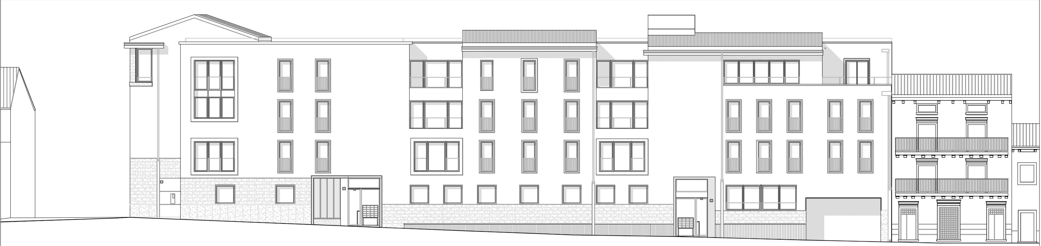 L’impianto presenta una ricca articolazione spaziale; pur proponendo elementi di innovazione, intrattiene evidenti legami con il contesto caratterizzato dalla compresenza di due differenti scale dimensionali, quella del tessuto denso di facciate ottocentesche con alternanza di case di piccole e medie dimensioni, portali e recinti, nei lunghi fronti sud ed nord e quello della città novecentesca e della ricostruzione del dopoguerra, con condomini ed edifici pubblici di grandi dimensioni, nella testa verso est. Per assecondare questa caratteristica il progetto gioca sulla diversificazione dei volumi, delle facciate e delle bucature; le variazioni altimetriche producono, sul principio insediativo dell’aggregazione lineare, continue modifiche, sia in pianta che in alzato, dando vita a una geometria articolata e dinamica. L’esito architettonico è una cortina stradale quasi “metafisica” sul lato ovest della via Bertoni, compatta e razionale verso il lungo lato sud verso vicolo San Domenico, dove le finestrature regolari danno il ritmo mentre le grandi finestre e i vuoti delle logge creano movimenti ed eccezioni; più vivace e volumetrica la facciata del lato nord scolpita dai pieni del bow window al piano primo e dall’arretramento a più livelli dei fronti superiori.