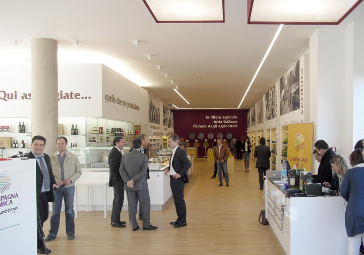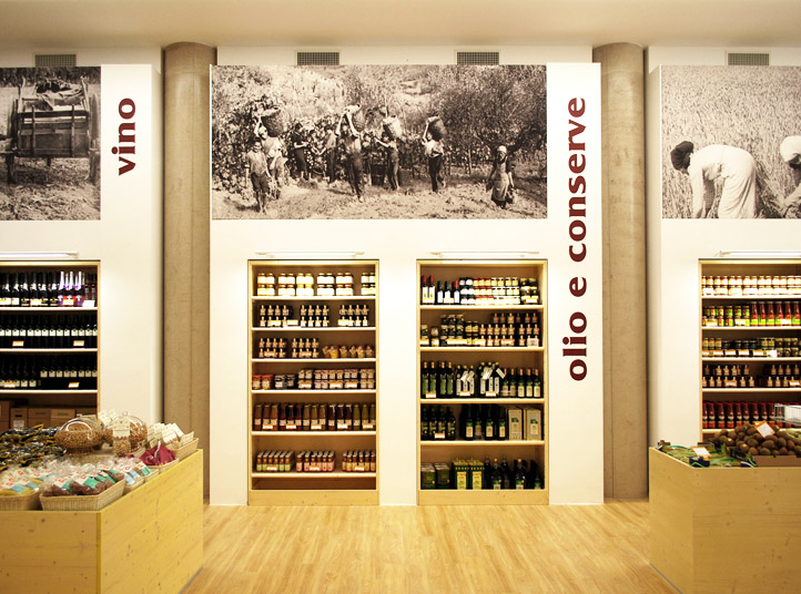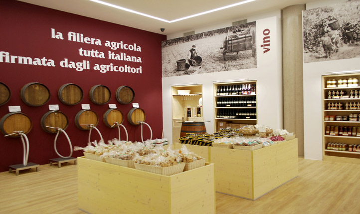 Lo spazio vendita dei prodotti della filiera italiana degli agricoltori è stato affrontato facendo della comunicazione il tema principale del progetto. Il racconto della distribuzione “dal produttore al consumatore” e del legame con il territorio è sviluppato con l’allestimenti di fotografie storiche del mondo agricolo, riprodotte in grande formato. Le immagini e le scritte caratterizzano le pareti e accompagnano il percorso di vendita.