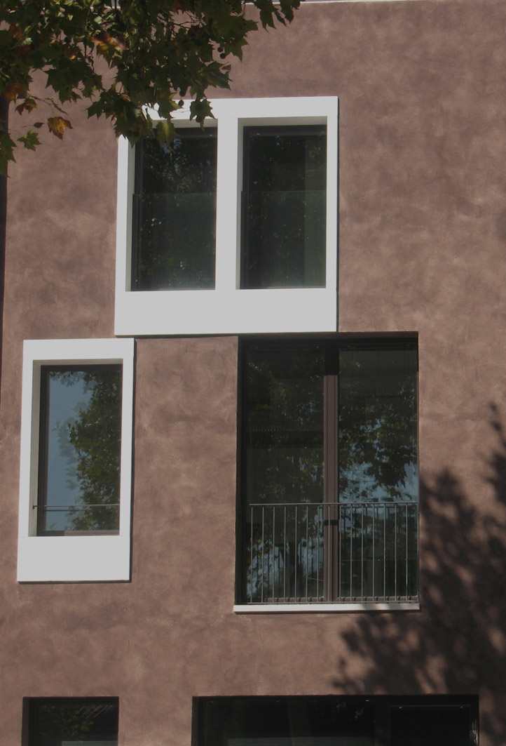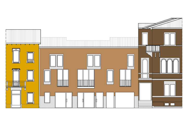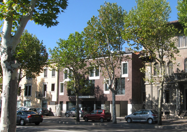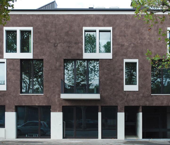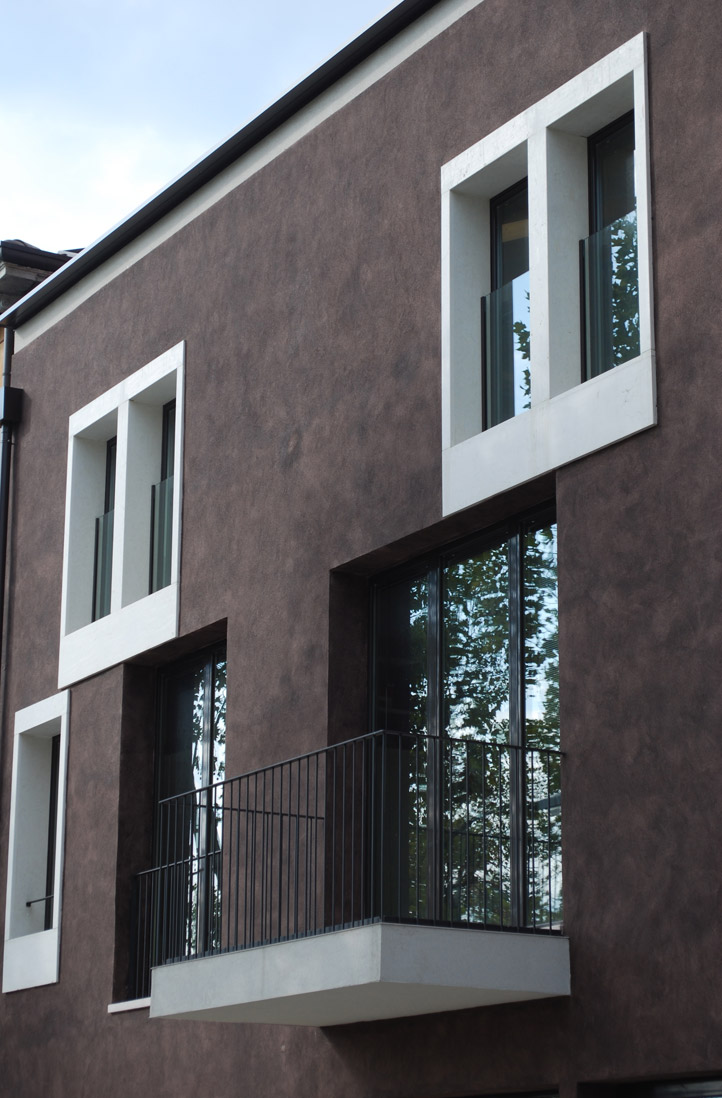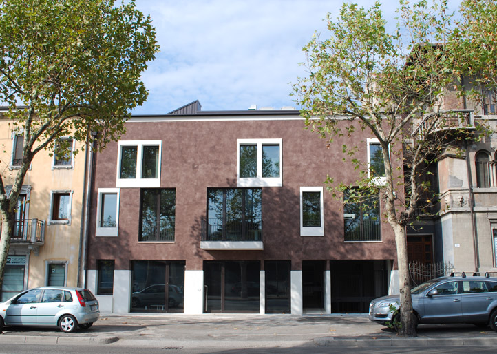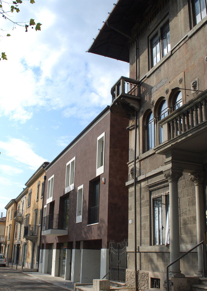 Il progetto di ristrutturazione ha previsto il rifacimento delle facciata sul viale mantenendo la continuità della cortina edilizia consolidata. L’edificio, nella sua modernità, appare rispettoso della tradizione grazie alla ripresa di stilemi e allineamenti degli edifici vicini, quali le finestre binate bordate da intonaco bianco a risalto sulla superficie ad intonaco scuro. Gli elementi nuovi, quali il balcone e le ampie aperture del piano livello, sono stati lasciati crudi, privi di risalto.
